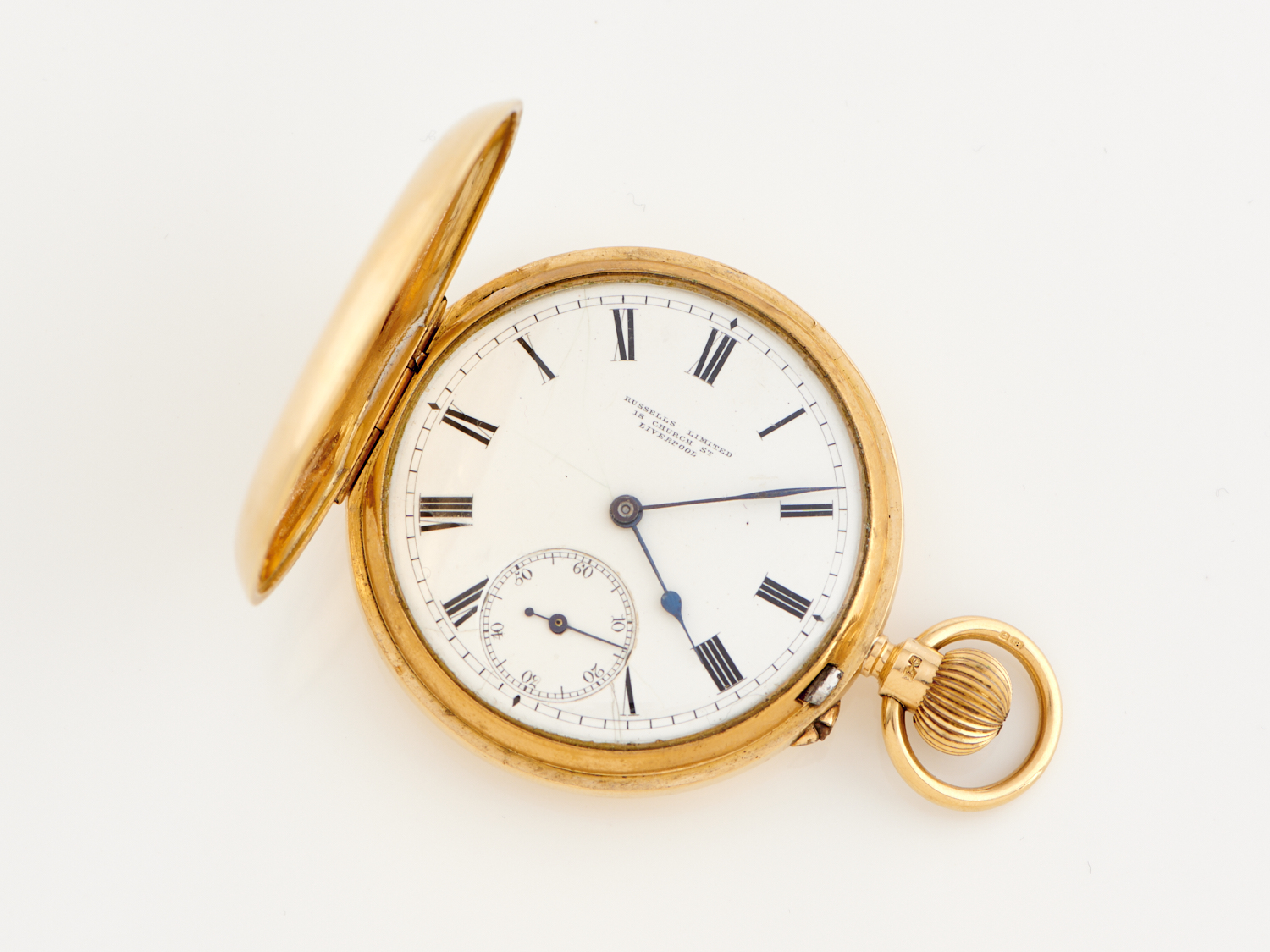 A CROWN WIND POCKET WATCH BY RUSSELLS LIMITED TO A CASE IN 18CT GOLD, 95.7GMS (INCLUDING MOVEMENT AND DIAL)