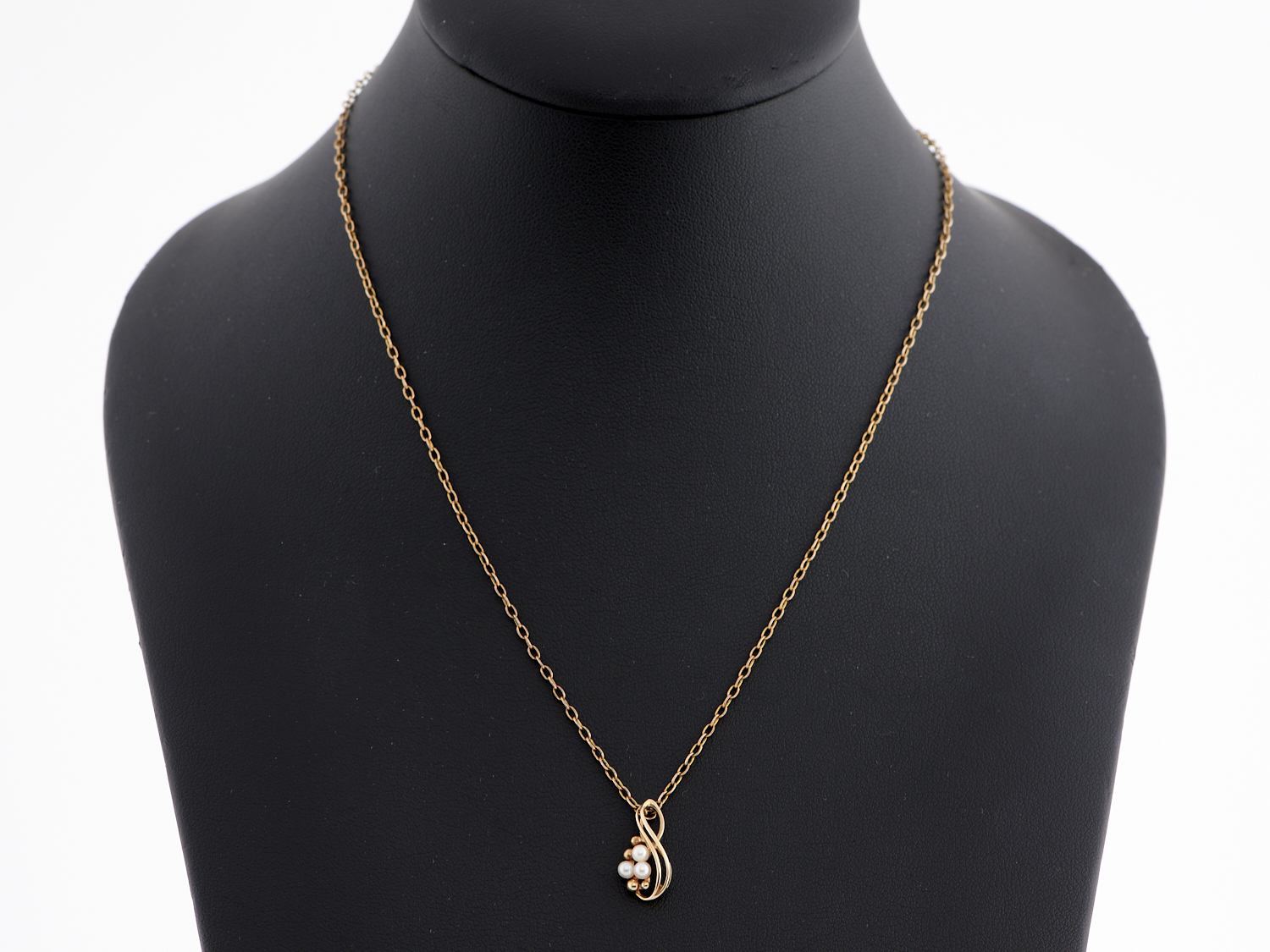 A SEED PEARL PENDANT IN 9CT GOLD, SIZE 7.9 X 16.2MM, WEIGTH .6GMS, TO A CHAIN IN GOLD PLATE, LENGTH 420MM