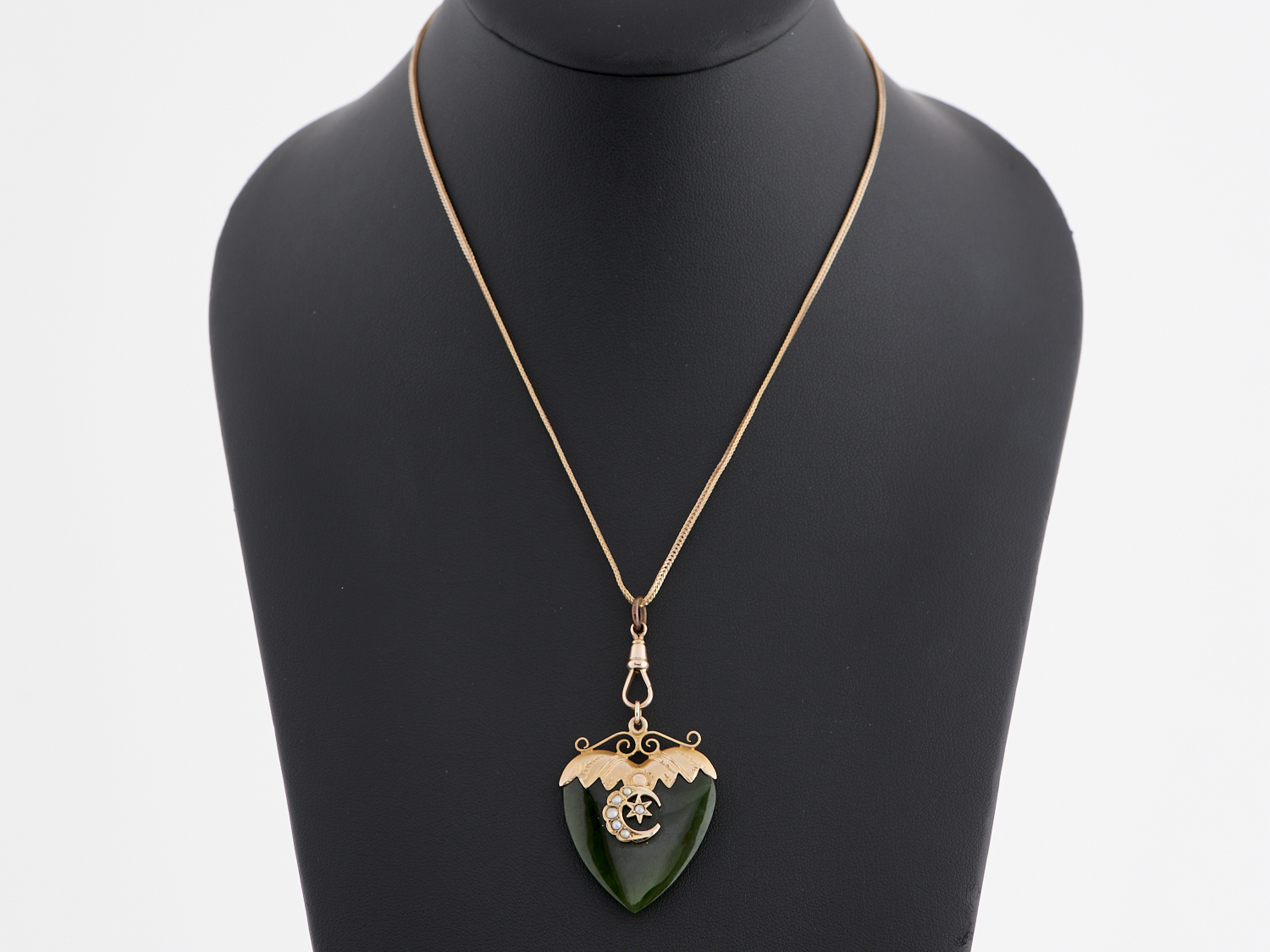 A NEPHRITE HEART PENDANT DECORATED WITH A SEED PEARL STAR AND CRESENT IN 9CT GOLD, PENDANT SIZE 35 X 39MM, TO A CHAIN IN 9CT GOLD, CHAIN LENGTH 380MM, WEIGHT 10.7GMS