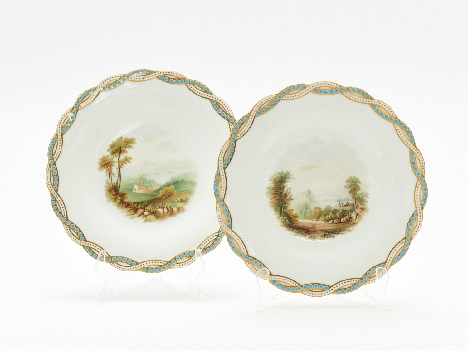TWO MINTON PLATES C.1857 WITH HAND-PAINTED LANDSCAPE DECORATION DIA.23CM, LEONARD JOEL LOCAL DELIVERY: SMALL