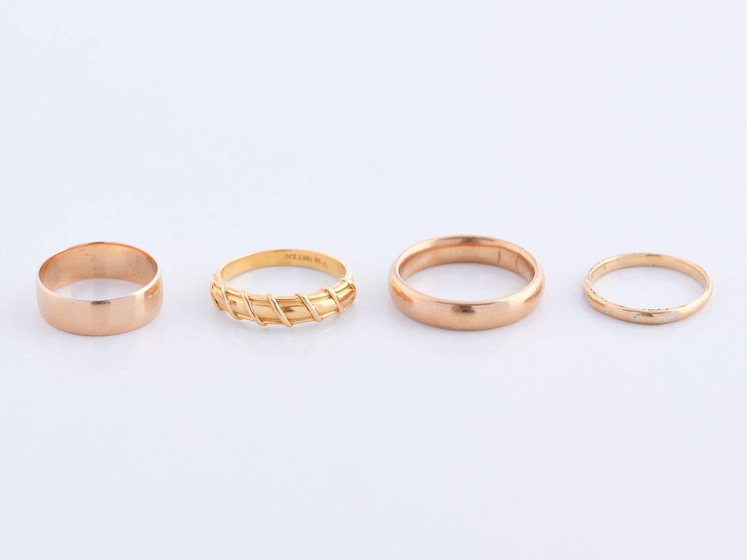 TWO RINGS IN 18CT GOLD, SIZES J AND N, TOTAL WEIGHT 5.4GMS, AND TWO IN 15CT GOLD, SIZES O AND J, TOTAL WEIGHT 7.3GMS