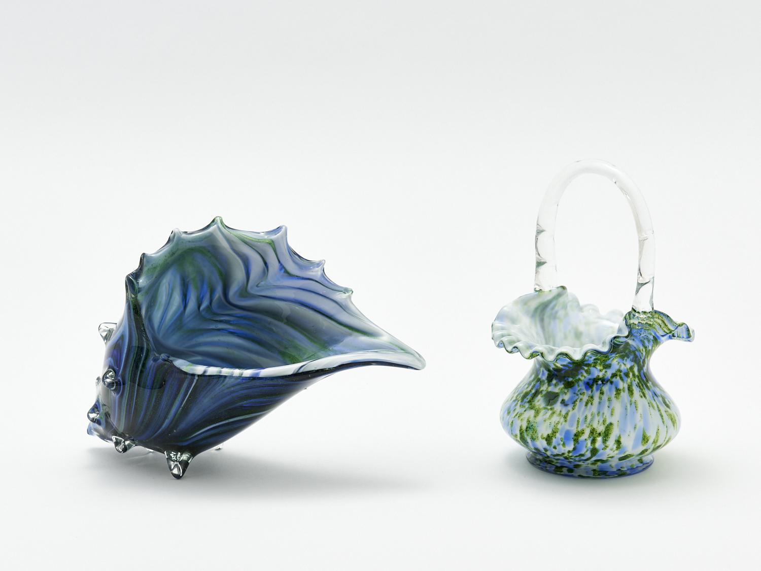 TWO PIECES OF ART GLASS INCLUDING SHELL AND BASKET (A/F) W.26CM (LARGEST), LEONARD JOEL LOCAL DELIVERY: SMALL