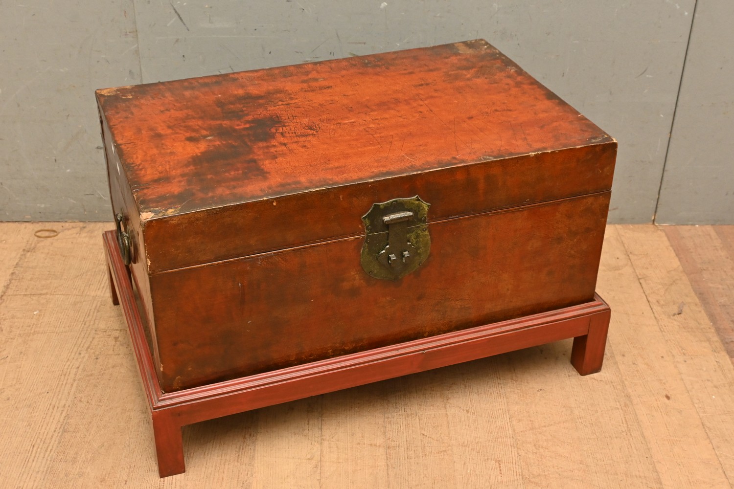 A CHINESE RED LAQUERED CHEST ON STAND (A/F) ( 47H X 79W X 54D CM) (LEONARD JOEL DELIVERY SIZE: LARGE)