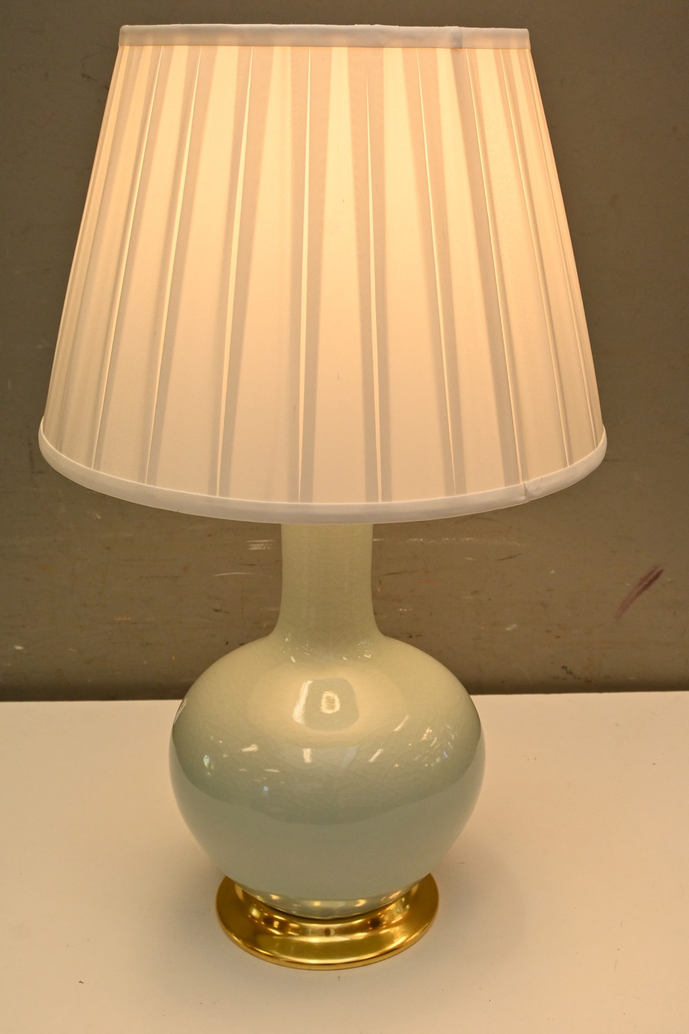 A CERAMIC CRACKLE GLAZE TABLE LAMP WITH BRASS DETAILS AND SILK SHADE ( 72H X 44 DIAMETER CM) (LEONARD JOEL DELIVERY SIZE: LARGE)