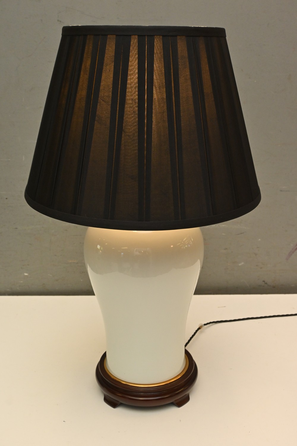 A CERAMIC TABLE LAMP WITH BRASS DETIALING WITH SILK SHADE ( 67H X 40 DIAMETER CM) (LEONARD JOEL DELIVERY SIZE: LARGE)