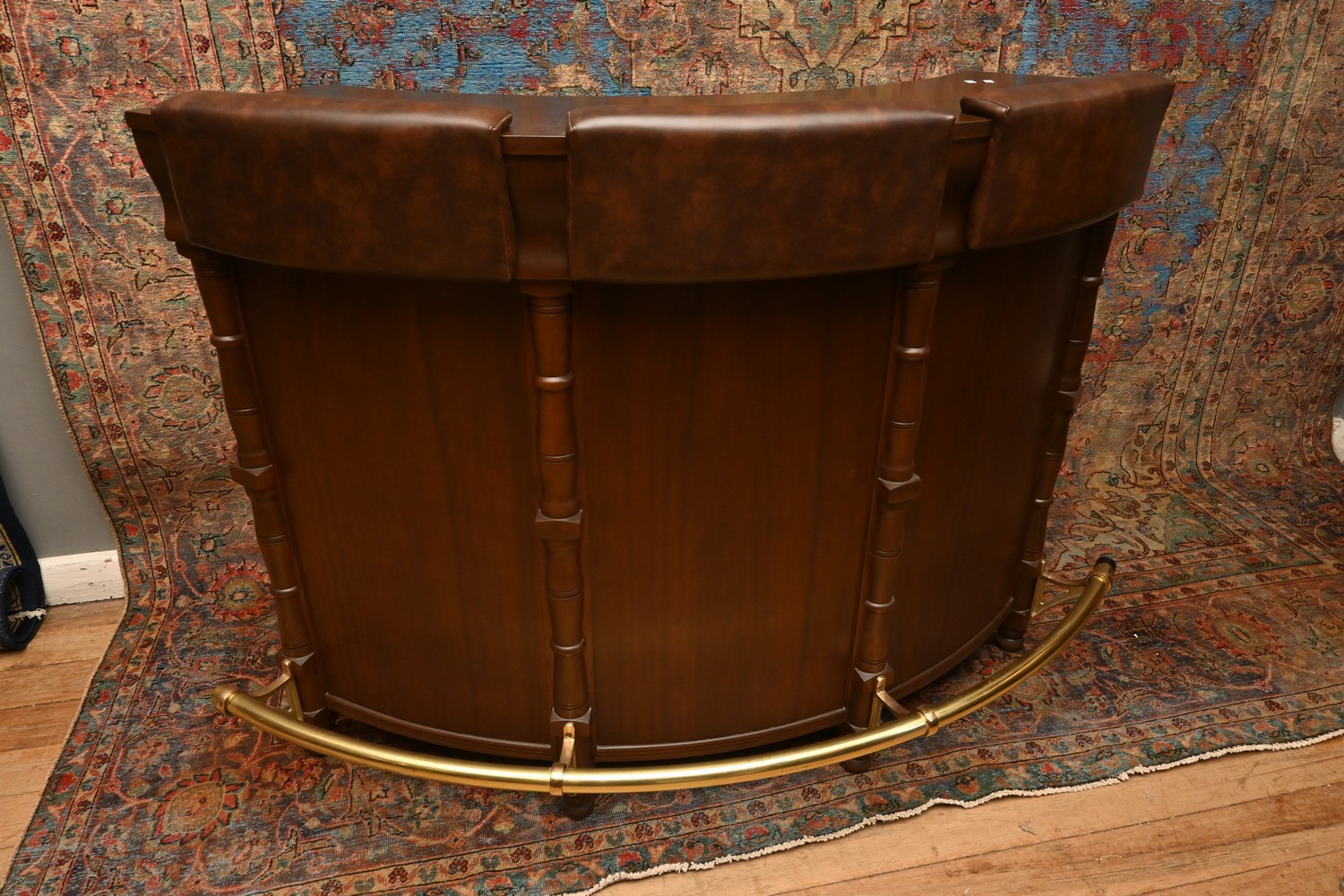 A RETRO MAHOGANY VINYL AND BRASS CURVED BAR (104H X 137W X 81D CM) (PLEASE NOTE THIS HEAVY ITEM MUST BE REMOVED BY CARRIERS AT THE CUSTOMER'S EXPENSE. LEONARD JOEL STAFF CANNOT ASSIST CARRYING THIS ITEM) (X-LARGE ITEM)