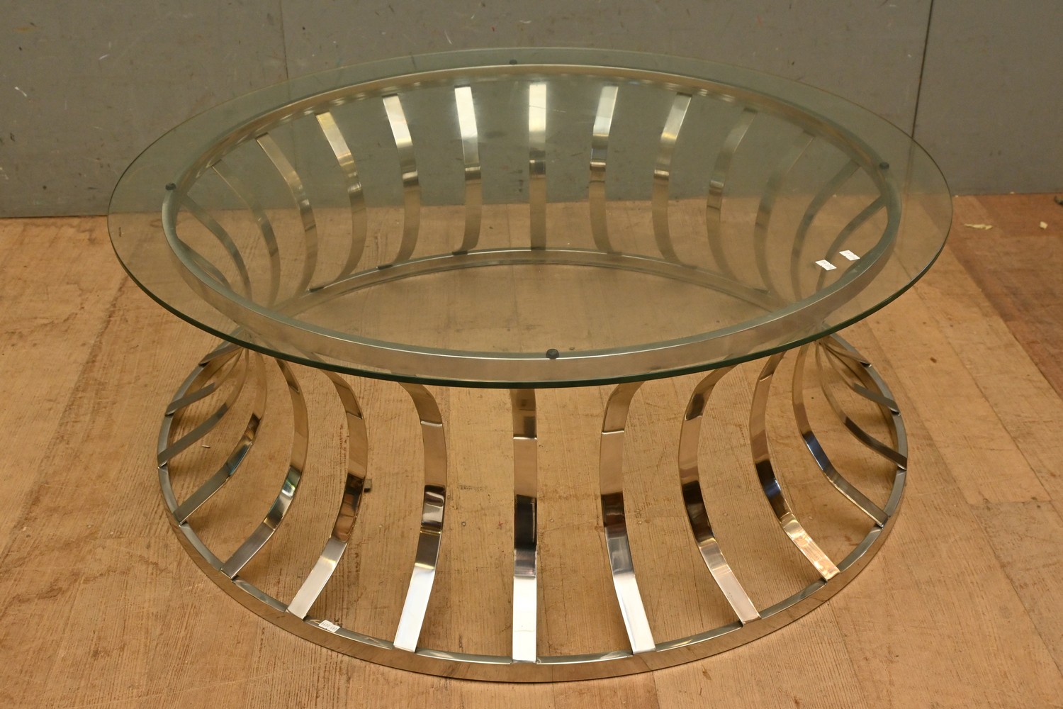 A CIRCULAR CHROME BASE GLASS TOP COFFEE TABLE (H38 X D100 CM) (LEONARD JOEL DELIVERY SIZE: EXTRA-LARGE)