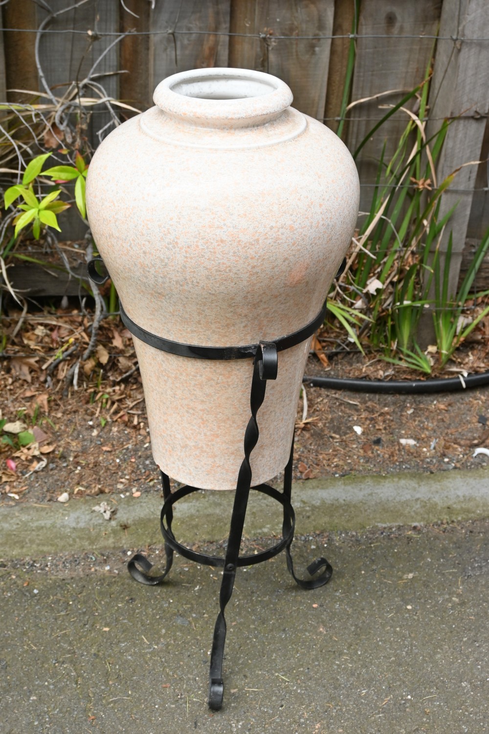 AN AUSTRALIAN GLAZED CERAMIC PLANTER VASE IN WROUGHT IRON BLACK BASE (A/F) (H88 X D37 CM) (LEONARD JOEL DELIVERY SIZE: LARGE)