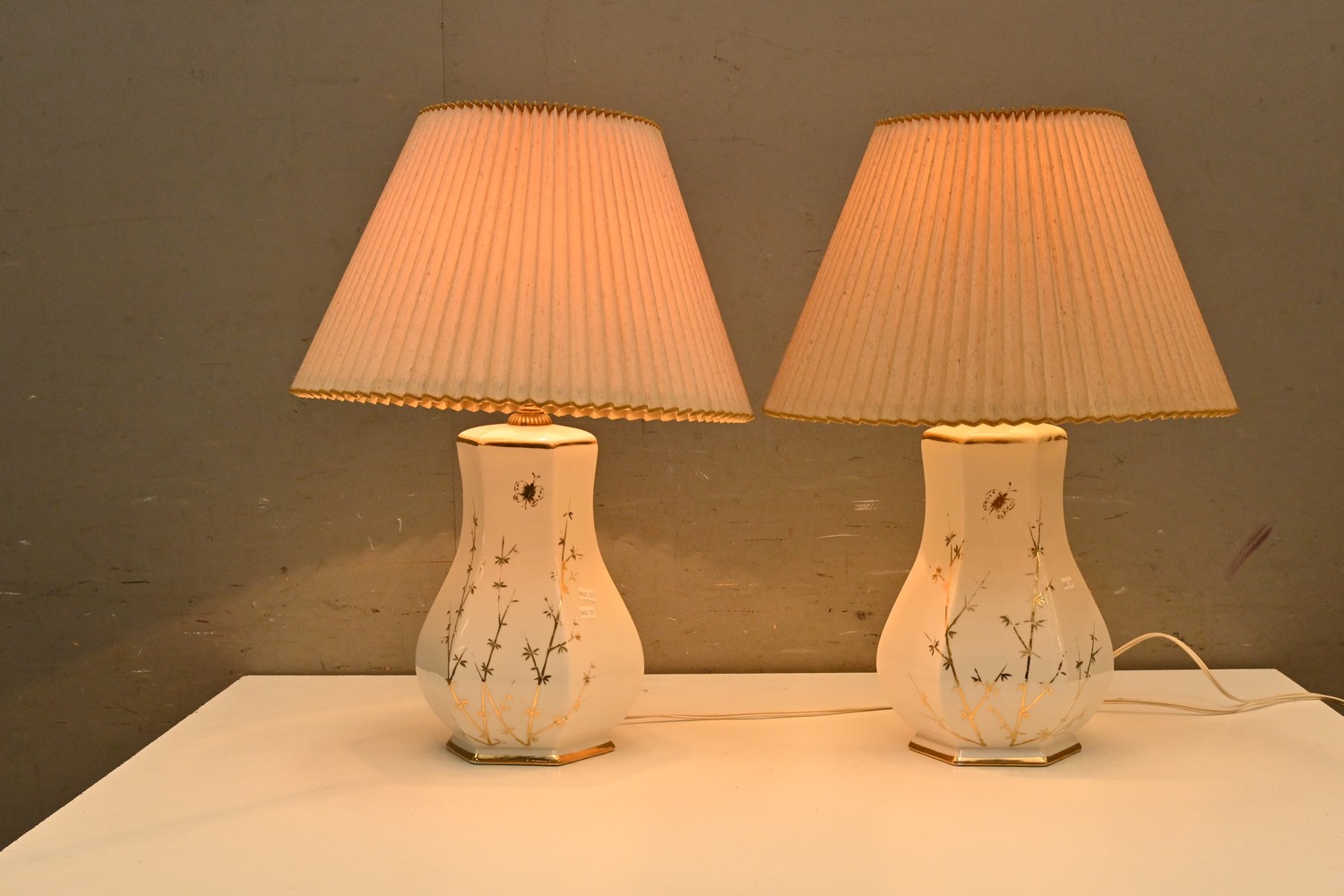 A PAIR GLAZED CERAMIC HANDPAINTED GILT DECORATED TABLE LAMPS WITH ORIGINAL SHADES (A/F) ( 60H X 42 DIAMETER CM) (LEONARD JOEL DELIVERY SIZE: LARGE)
