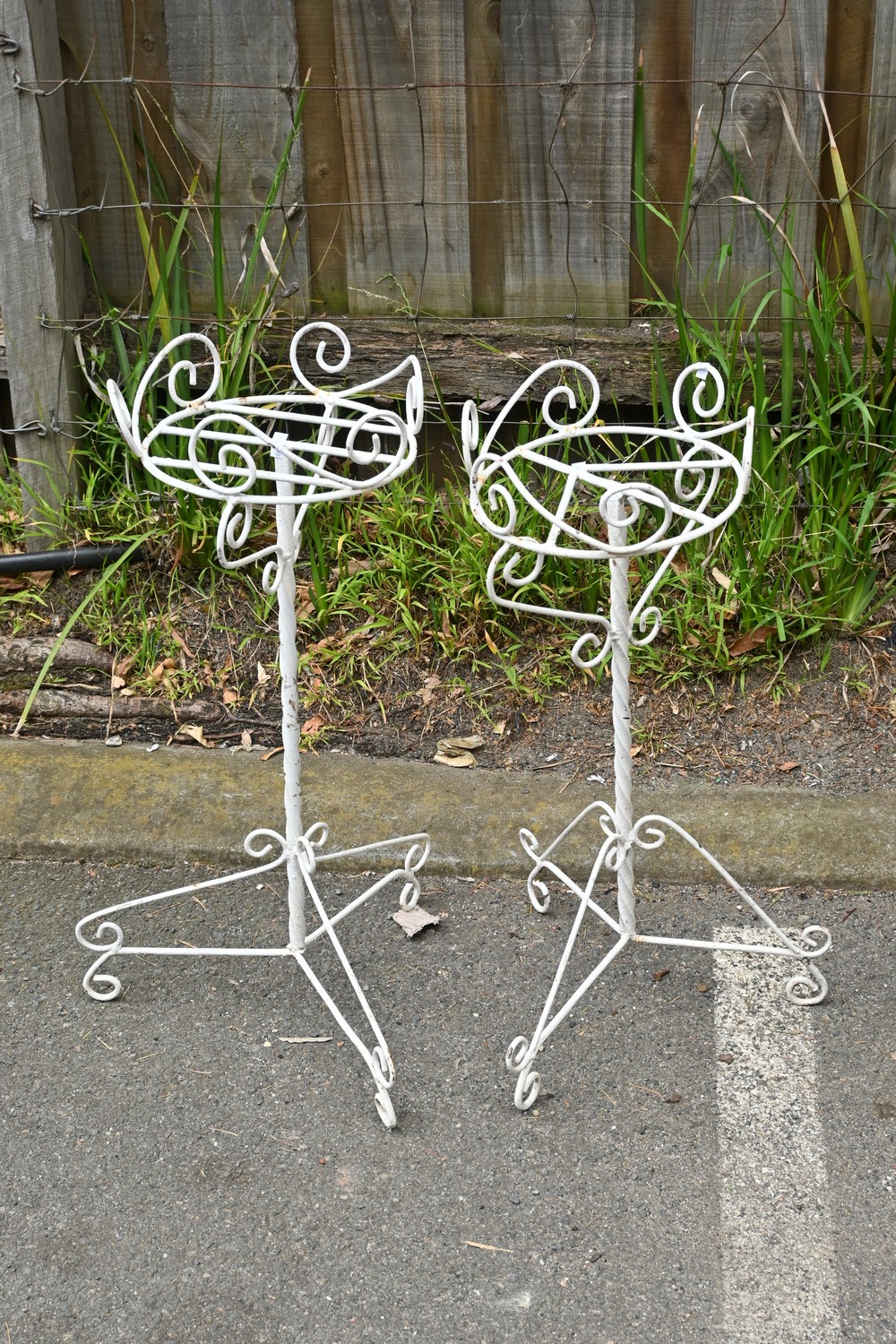 PAIR OF VINTAGE 1920S FRENCH WHITE WROUGHT IRON PLANT STANDS (A/F) (H68 X D39 CM) (PLEASE NOTE THIS HEAVY ITEM MUST BE REMOVED BY CARRIERS AT THE CUSTOMER'S EXPENSE. LEONARD JOEL STAFF CANNOT ASSIST CARRYING THIS ITEM) (X-LARGE ITEM)