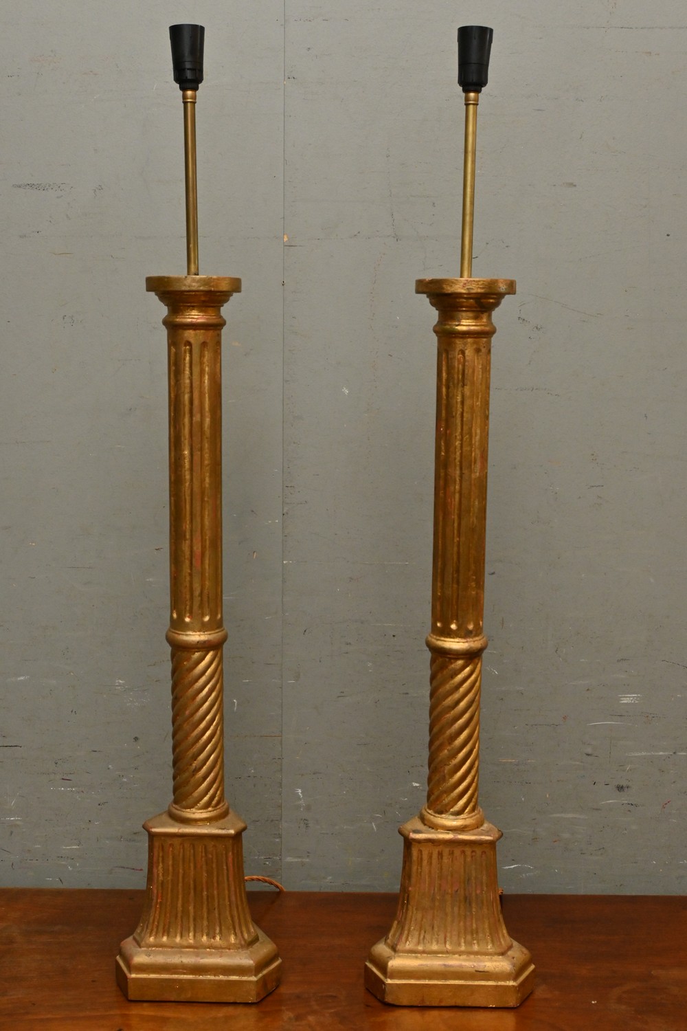 A PAIR OF FRENCH STYLE GILDED CANDLESTICKS WITH LAMP FITTINGS (110H CM) (LEONARD JOEL DELIVERY SIZE: LARGE)