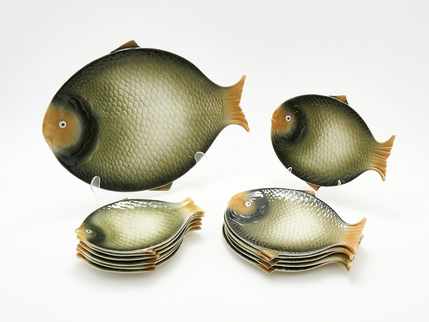A GROUP OF MAJOLICA FISH PLATES INCLUDING SERVING PLATE, W.41CM (LARGEST), LEONARD JOEL LOCAL DELIVERY: MEDIUM