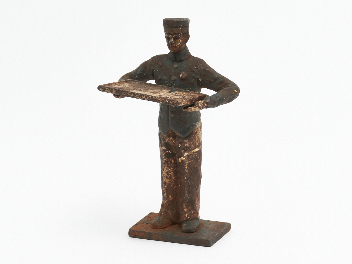 A CAST IRON BELLBOY WAITER CARD TRAY, H.25CM, LEONARD JOEL LOCAL DELIVERY: SMALL