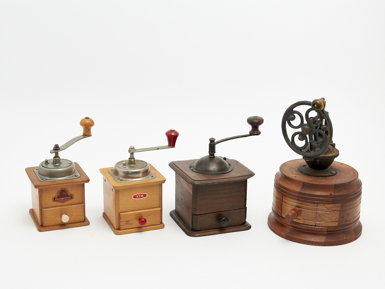 FOUR VINTAGE COFFEE GRINDERS, H.32CM (TALLEST), LEONARD JOEL LOCAL DELIVERY: MEDIUM
