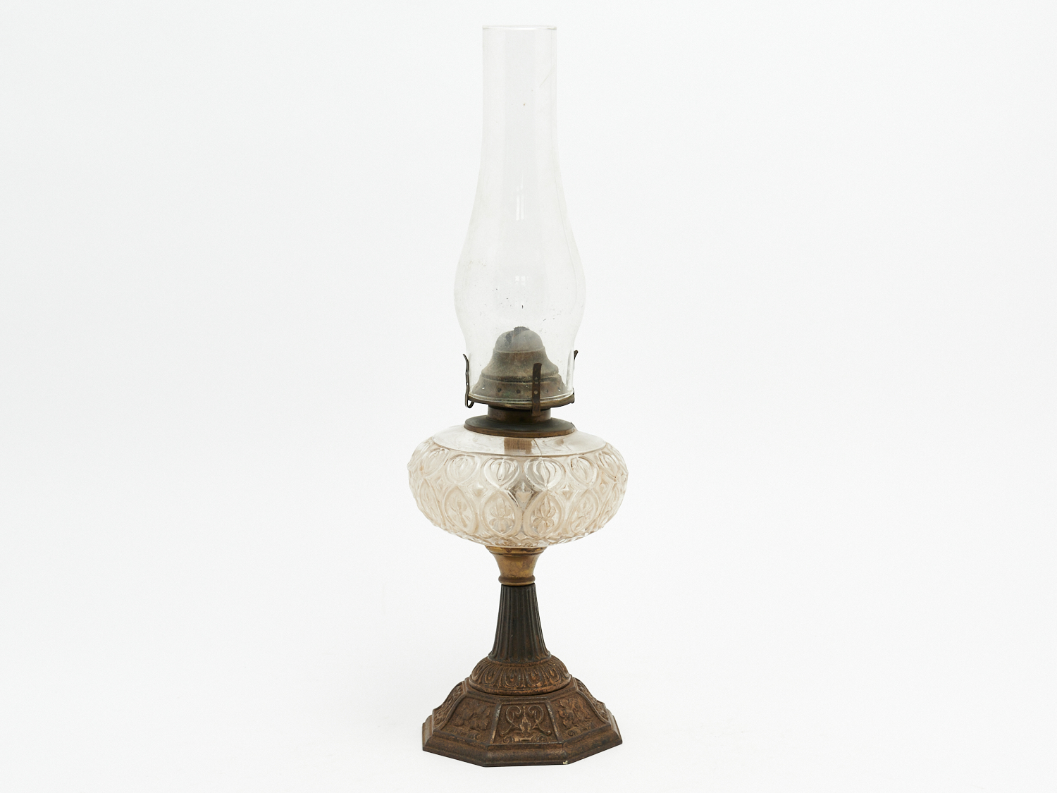 A BRASS AND CAST-IRON BASED PRESSED GLASS OIL LAMP, H.51CM, LEONARD JOEL LOCAL DELIVERY: MEDIUM