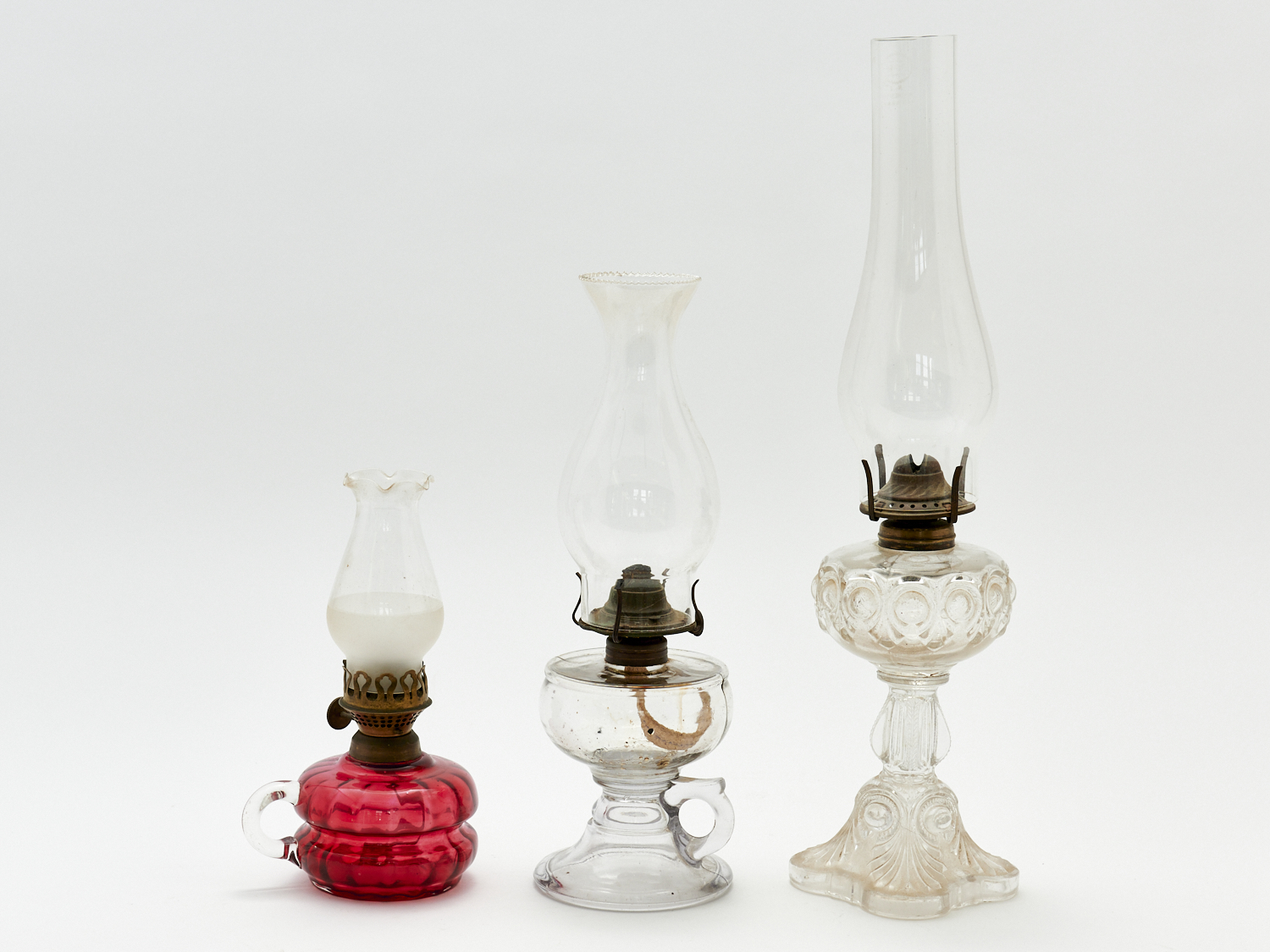 THREE 19TH-CENTURY OIL LAMPS ALL WITH GLASS FLUES, H.47CM (TALLEST), LEONARD JOEL LOCAL DELIVERY: MEDIUM