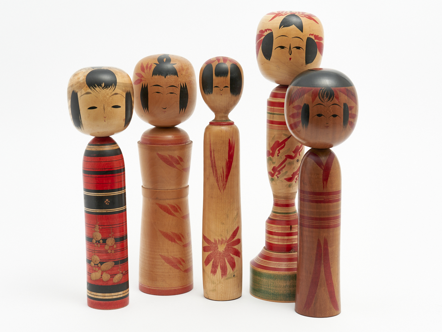 A SET OF FIVE VINTAGE JAPANESE HAND PAINTED WOODEN KOKESHI DOLLS, H.37CM (TALLEST), LEONARD JOEL LOCAL DELIVERY: MEDIUM