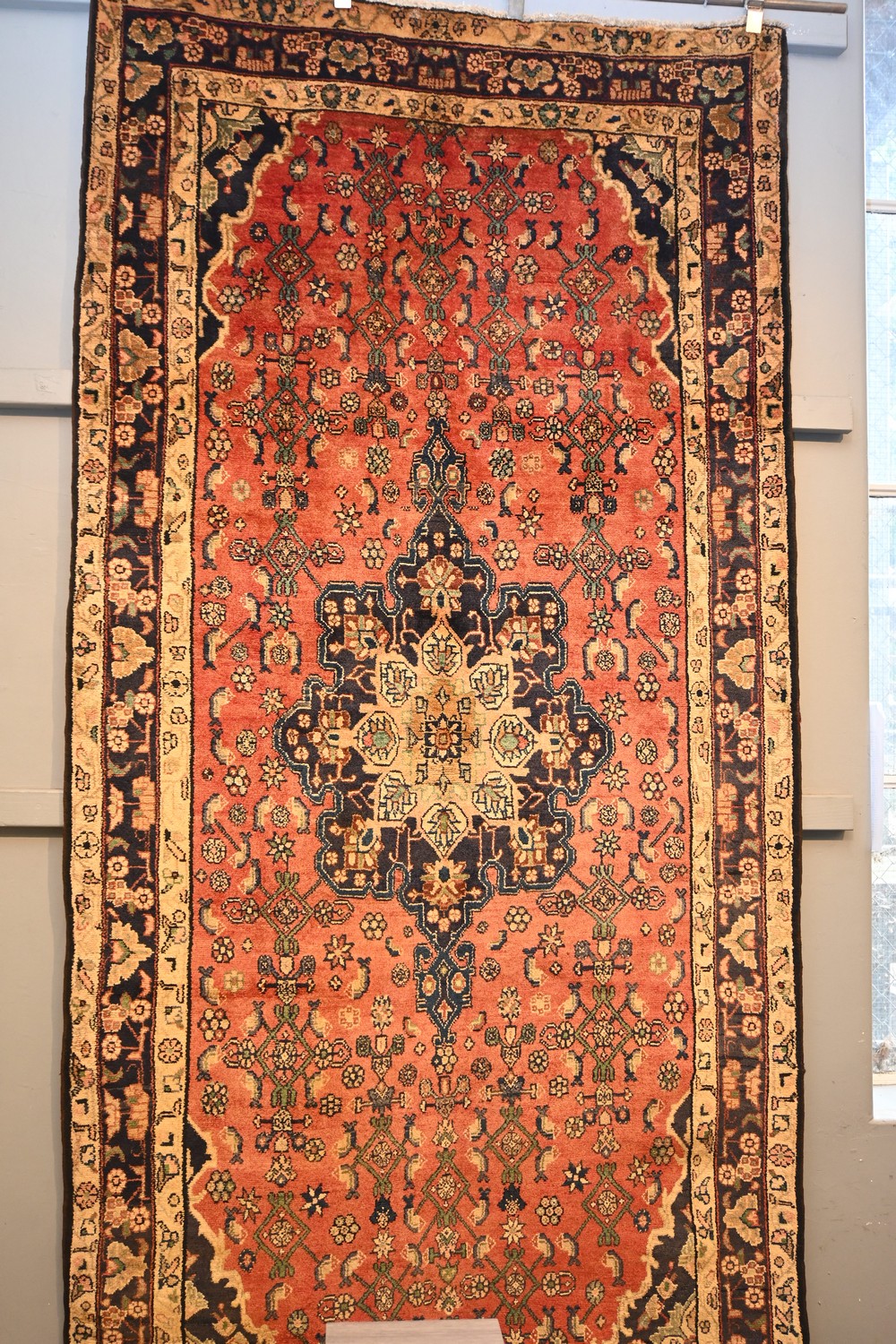A PERSIAN KOLYAIE RUG 100% WOOL & NATURAL DYES. HAND-KNOTTED VILLAGE WEAVE WITH TRIBAL DESIGN OF CENTRAL FLORAL MEDALLION IN A FIELD OF ALL OVER HERATI MAHI PATTERNS ON A SOFT RED TONE FIELD. BORDER OF FLORAL MOTIFS. SIZE: 289 X 143 CM ORIGIN: IRAN - RRP: $2,100 DOCUMENTATION OF AUTHENTICITY INCLUDED.