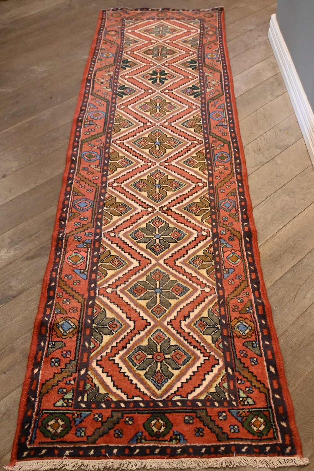 A HAND-KNOTTED PERSIAN ZAGEH RUNNER. CONTINUING DIAMOND SHAPED MEDALLIONS CONTAINING FLORAL AND GEOMETRIC MOTIFS, IN AN OPEN SOFT RED FIELD. 100% WOOL & NATURAL DYES. BORDER OF TRIBAL MOTIFS. SIZE: 310 X 80 CM ORIGIN: IRAN - RRP: $1,900 DOCUMENTATION OF AUTHENTICITY INCLUDED