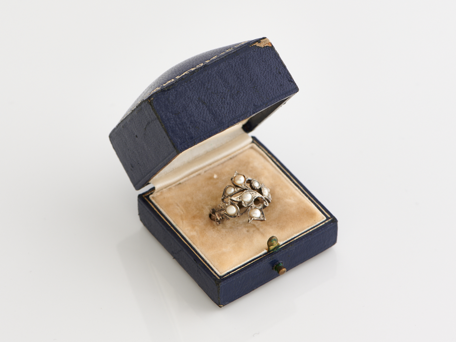 AN ANTIQUE SEED PEARL SET RING IN STERLING SILVER, SIZE M, ACCOMPANIED BY A WILLIAM DRUMMOND & CO. PERIOD BOX