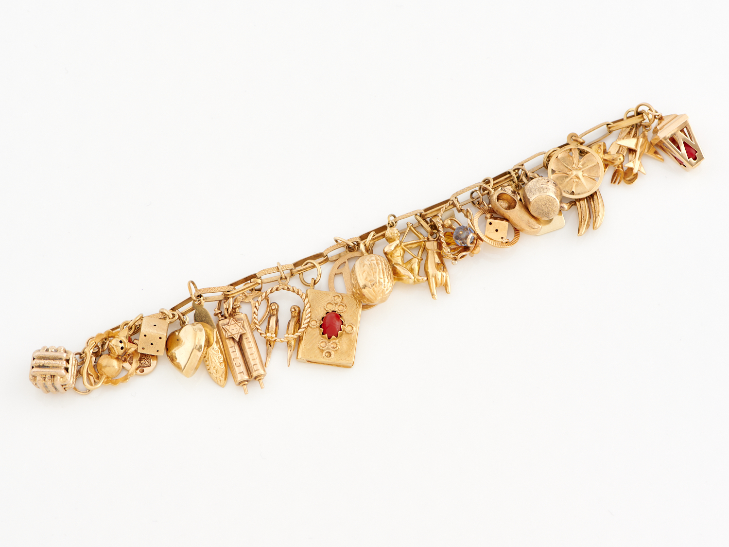 A CHARM BRACELET IN 18CT GOLD, FEATURING VARIOUS CHARMS IN 18CT, 14CT, 10CT & 9CT, LENGTH 195MM, TOTAL WEIGHT 61.3GMS