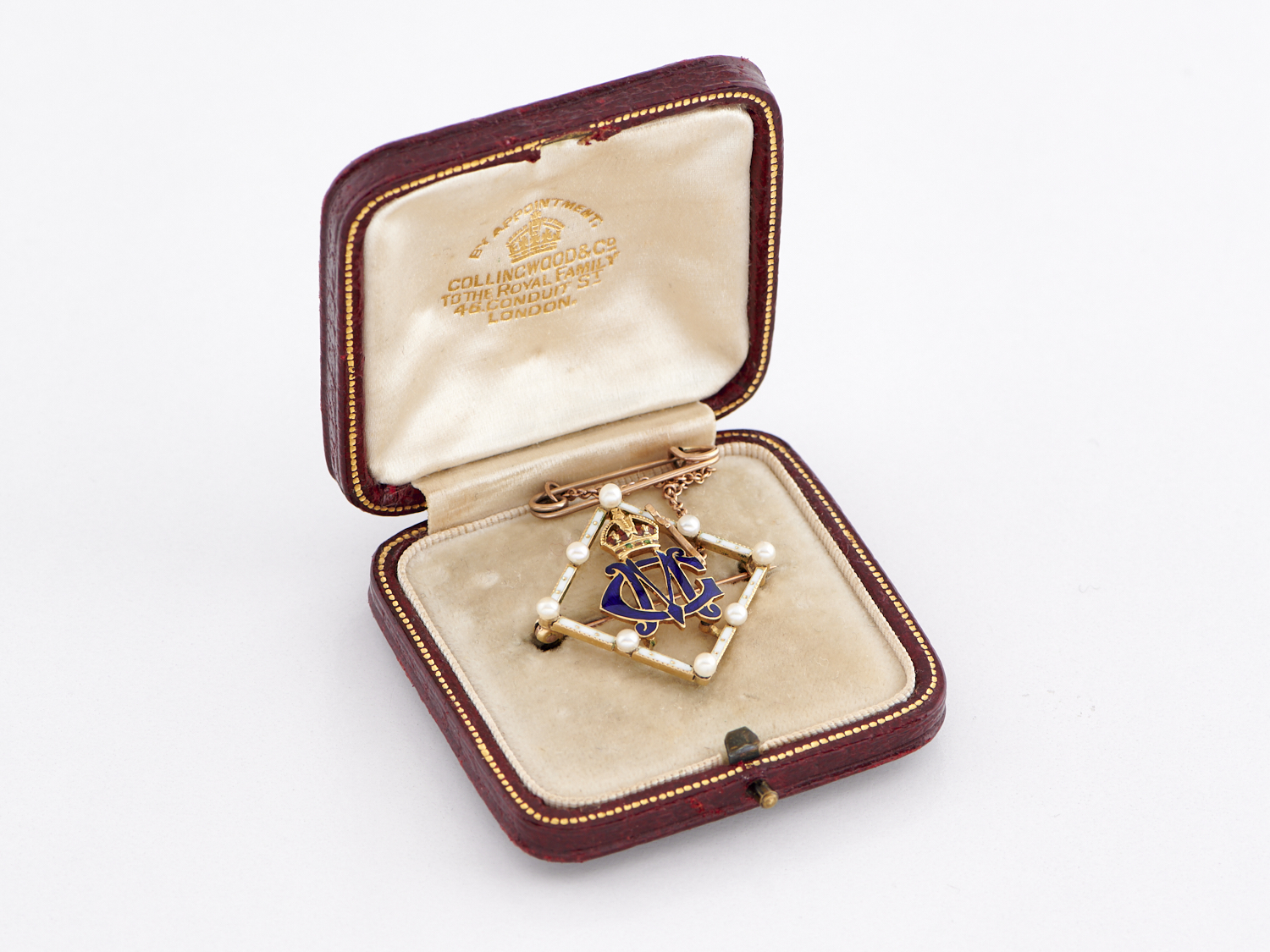 AN ENAMEL AND SEED PEARL BROOCH IN 15CT GOLD, ACCOMPANIED BY A FITTED COLLINGWOOD & CO, LONDON BOX, SIZE 27 X 27MM, WEIGHT 4.4GMS