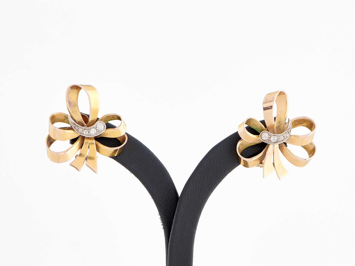 A PAIR OF RETRO DIAMOND EARRINGS IN 15CT GOLD AND PLATINUM, TO POST AND CLIP FITTINGS, LENGTH 30MM, 11.3GMS
