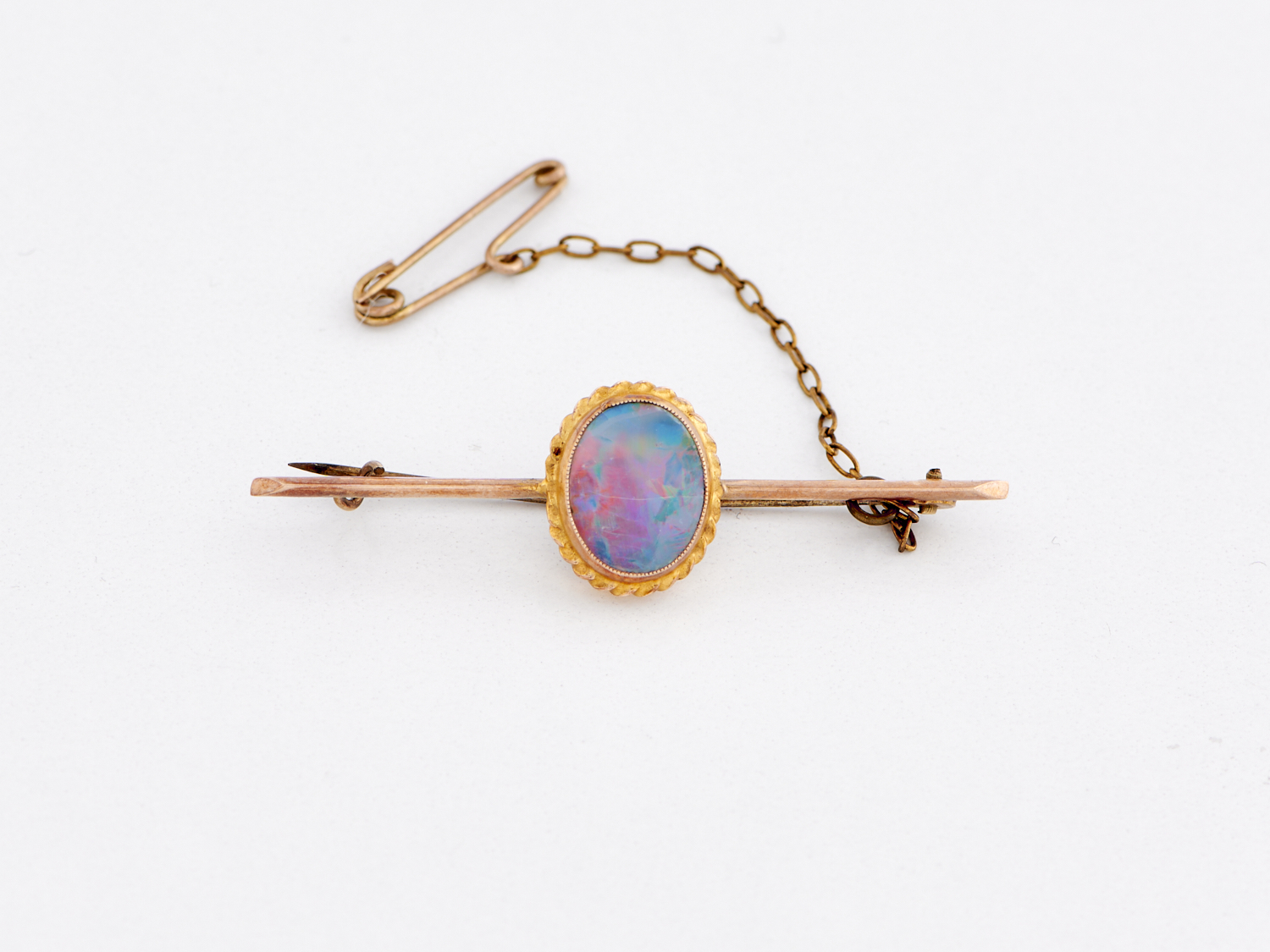 AN OPAL DOUBLET BROOCH IN 9CT GOLD TO A PIN IN BASE METAL, SIZE 13 X 48MM, WEIGHT 2.8GMS