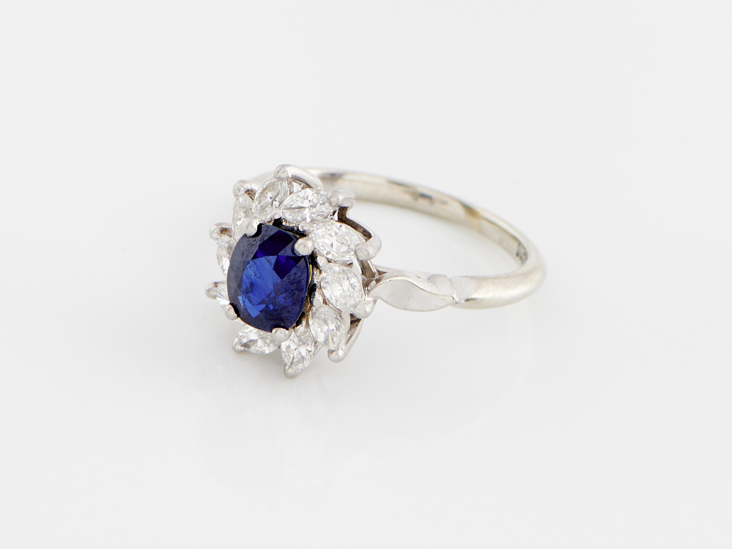 A SAPPHIRE AND DIAMOND RING IN 18CT WHITE GOLD, THE SAPPHIRE WEIGHING APPROXIMATELY 1.30 CTS, THE DIAMONDS TOTALLING APPROXIMATELY 1.30CTS, RING SIZE K1/2, WEIGHT 4.3GMS