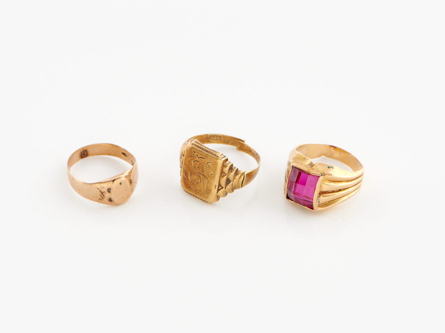 THREE GENTS RINGS TWO IN 14CT GOLD AND ONE IN 9CT GOLD, SIZE S, L AND L, TOTAL WEIGHT 10.2GMS