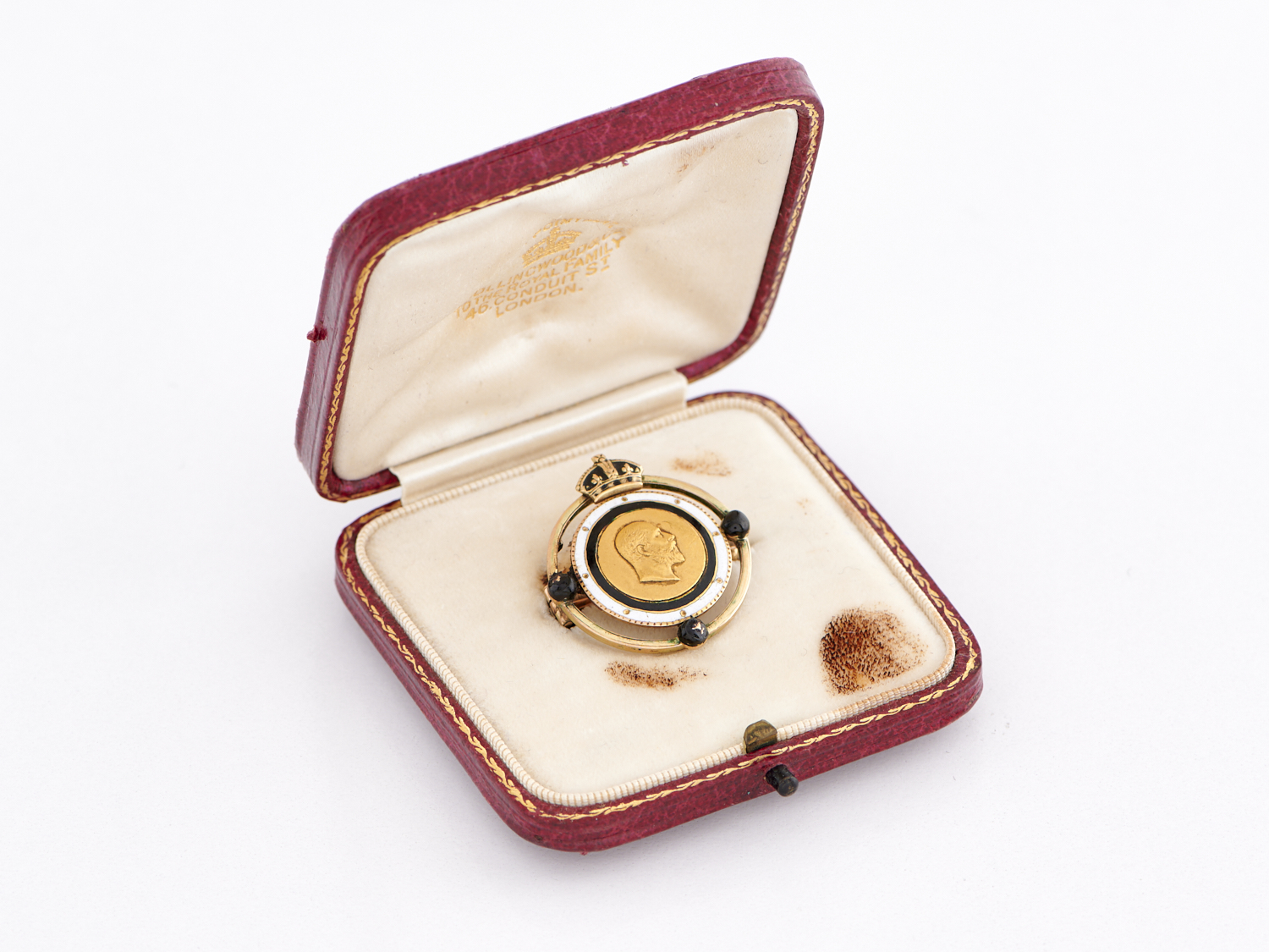 A KING EDWARD VII MEDALLION BROOCH IN ENAMEL AND 15CT GOLD, ACCOMPANIED BY FITTED COLLINGWOOD & CO, LONDON BOX, SIZE 23.1 X 24.6MM, WEIGHT 4.7GMS
