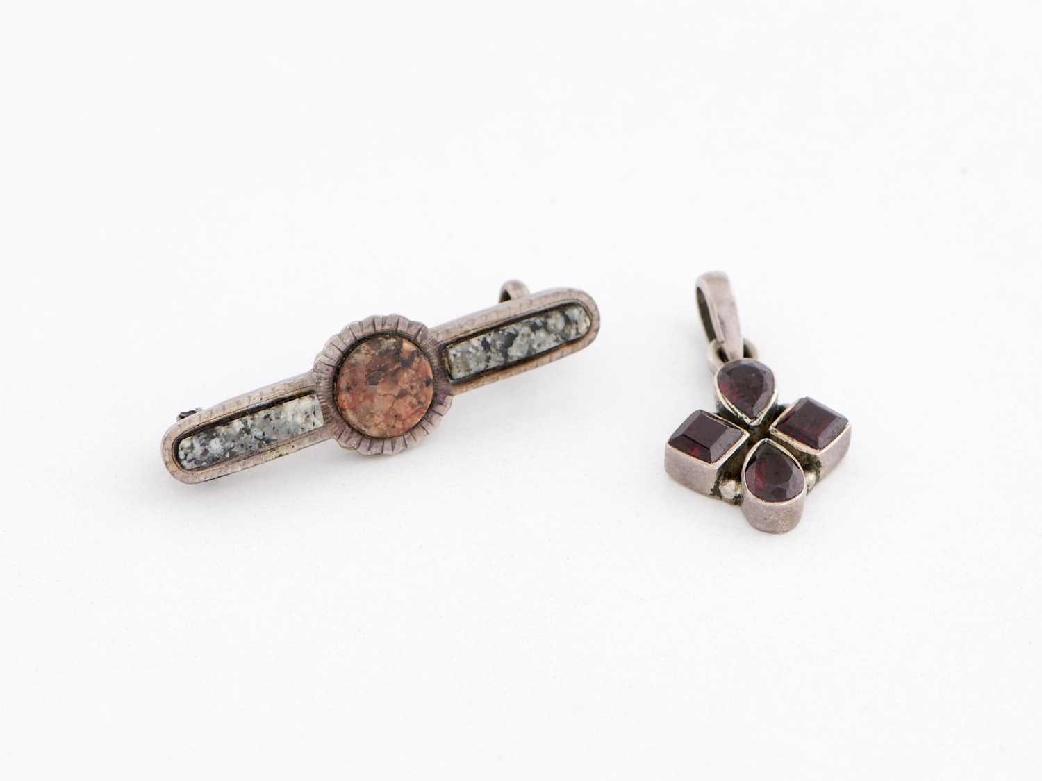 AN ANTIQUE HARDSTONE BROOCH IN STERLING SILVER, BIRMINGHAM HALLMARKS CIRCA 1900, TOGETHER WITH A GARNET CROSS PENDANT IN SILVER, TOTAL WEIGHT 4.5GMS