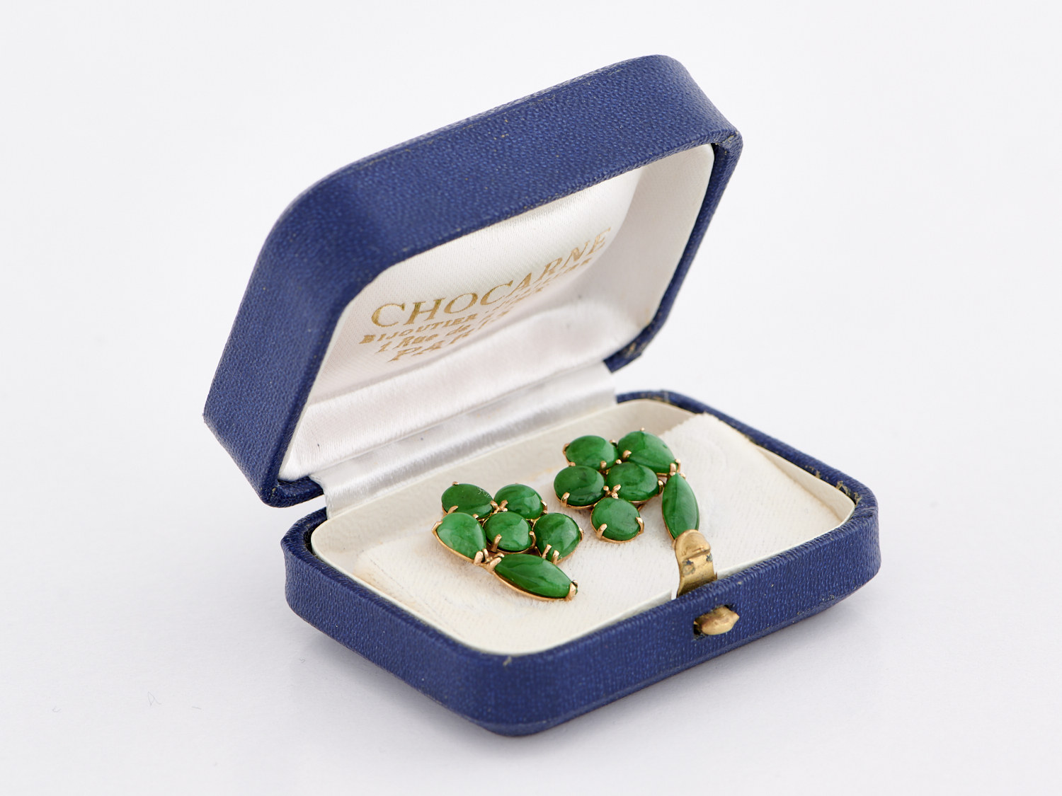 A PAIR OF JADE EARRINGS IN 18CT GOLD BY CHOCARNE, PARIS, FRENCH MARKS, ACCOMPANIED BY A FITTED CHOCARNE BOX, SIZE 16.6 X 21.4MM, WEIGHT