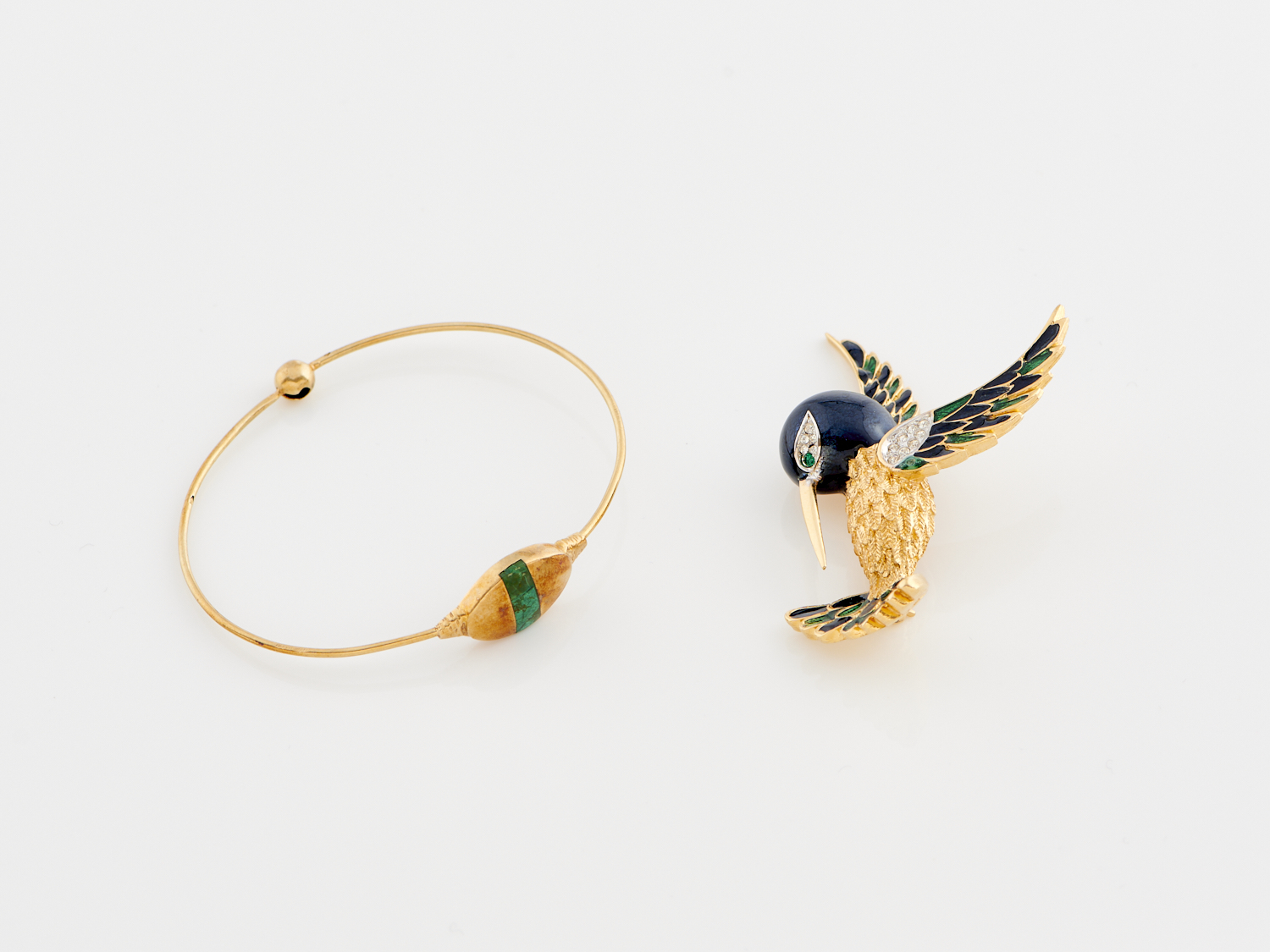A MALACHITE SET BANGLE IN 14CT GOLD (5.1GMS), INNER MEASUREMENTS 62 X 48MMM, ALONG WITH A COSTUME HUMMING BIRD BROOCH