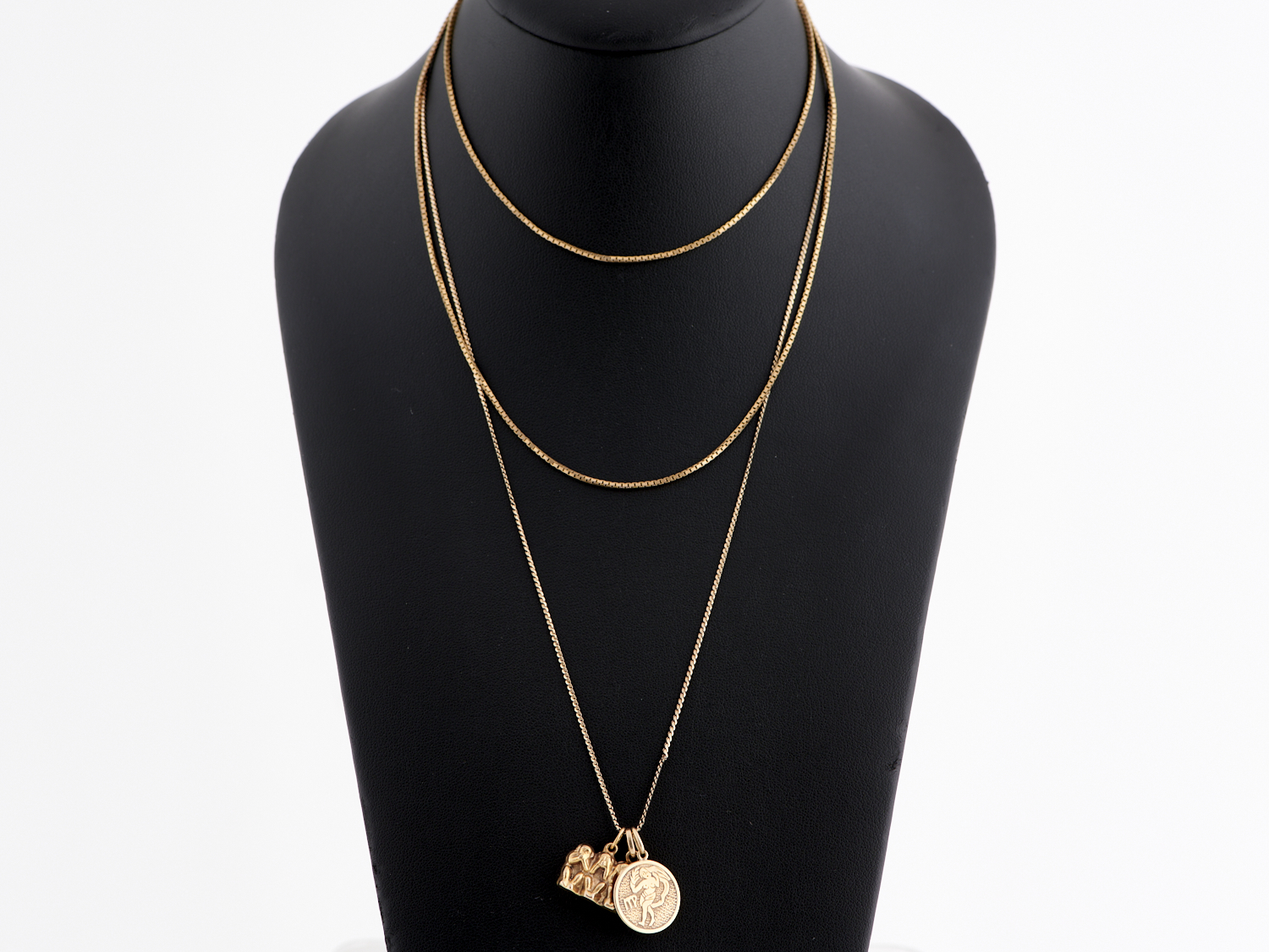 TWO BOX CHAINS WITH THREE CHARMS CHAINS IN 9CT GOLD AND 10CT GOLD, WITH CHARMS IN 9CT GOLD, TOTAL WEIGHT 11.7GMS