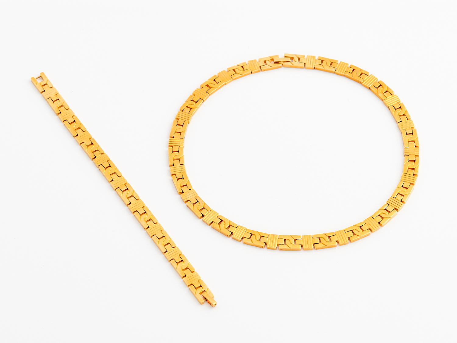PIERRE CARDIN, BRACELET AND NECKLACE SUITE - Styled in god tone metal, necklace length 430mm, bracelet 190mm, boxed.