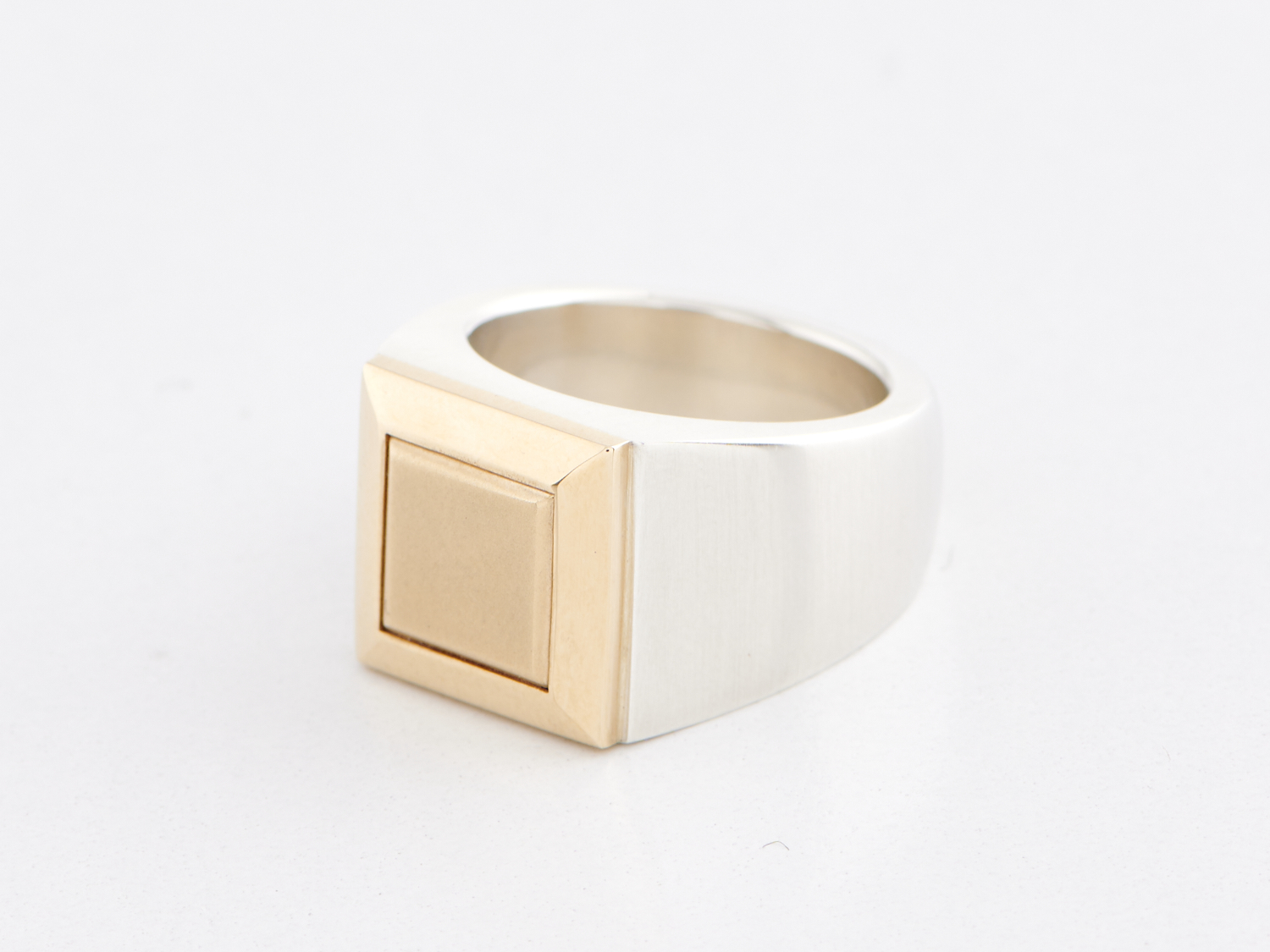 A SQUARE SIGNET RING IN 9CT GOLD AND STERLING SILVER, RING SIZE M, WEIGHT 21.2GMS