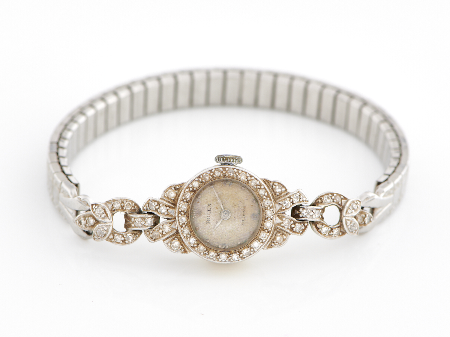 A ROLEX DIAMOND SET COCKTAIL WRISTWATCH IN 14CT WHITE GOLD, TO A FELXIBLE BASE METAL BRACELET, MANUAL WIND