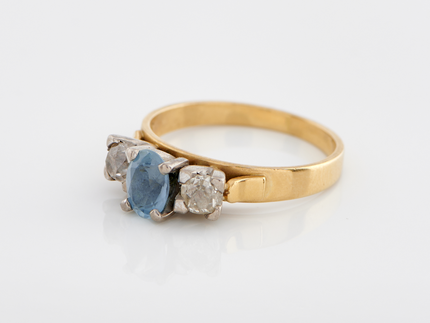 A BLUE TOPAZ AND DIAMOND RING IN 18CT GOLD, DIAMONDS ESTIMATED 0.30 CARATS, SIZE P1/2, 4.7GMS