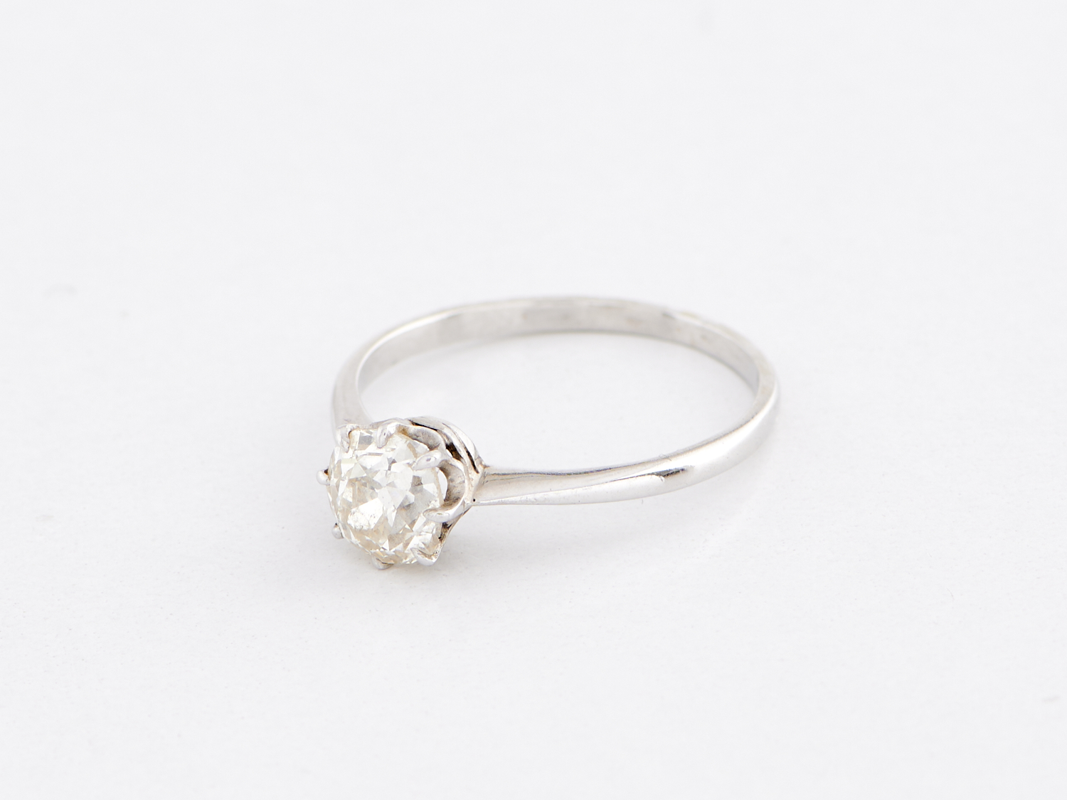 AN OLD MINE CUT DIAMOND SOLITAIRE RING IN PLATINUM, THE DIAMOND TOTALLING APPROXIMATELY 0.80CTS, RING SIZE P, WEIGHT 2.8GMS