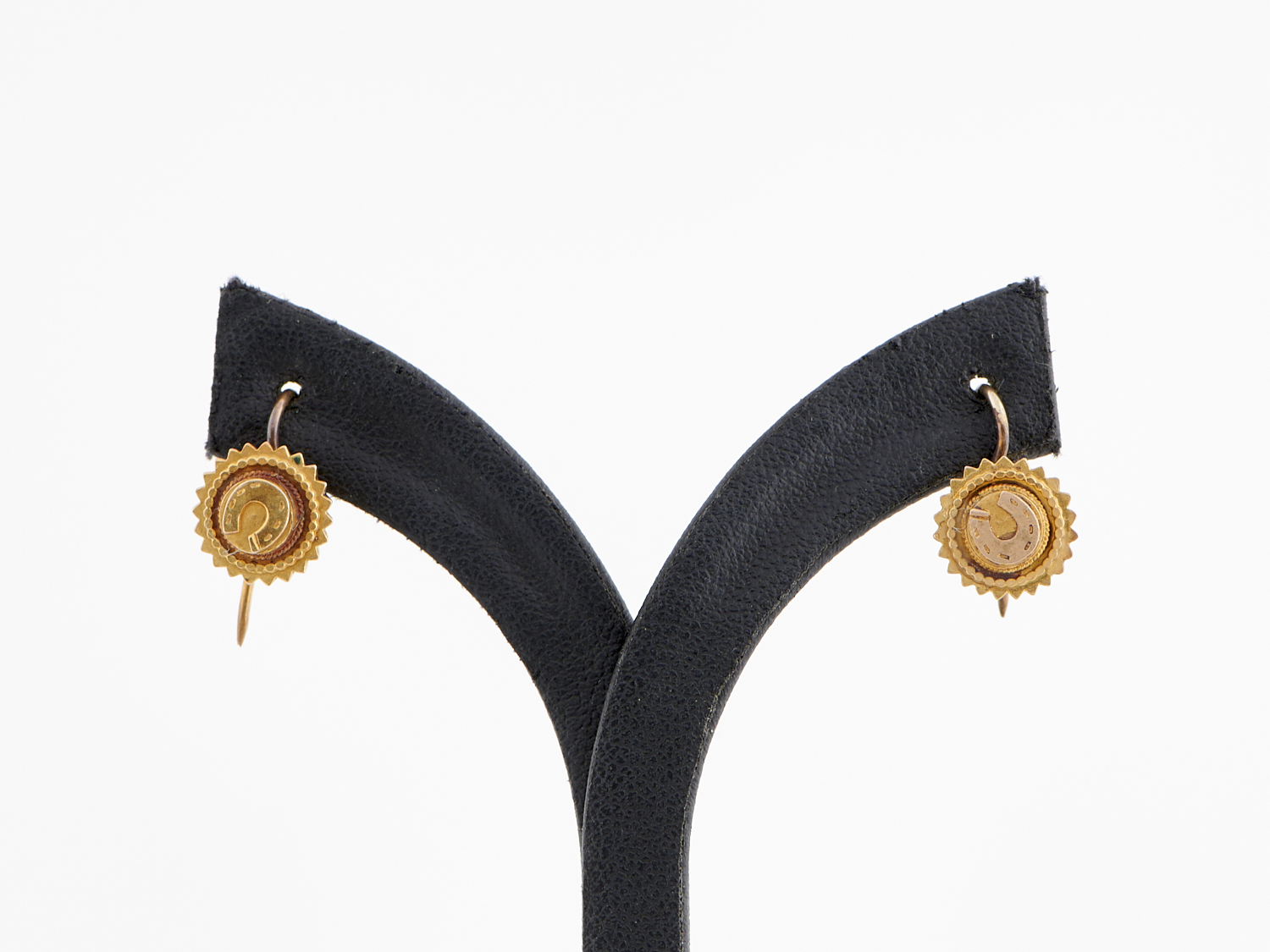 A PAIR OF VICTORIAN EARRINGS IN 18CT GOLD TO HOOK FITTINGS, DIAMETER 9.7MM, LENGTH 14.5MM, WEIGHT 1.6GMS