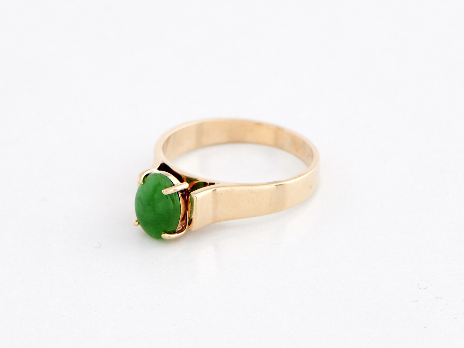 A JADEITE SET RING IN 9CT GOLD, RING SIZE P, WEIGHT 3.6GMS