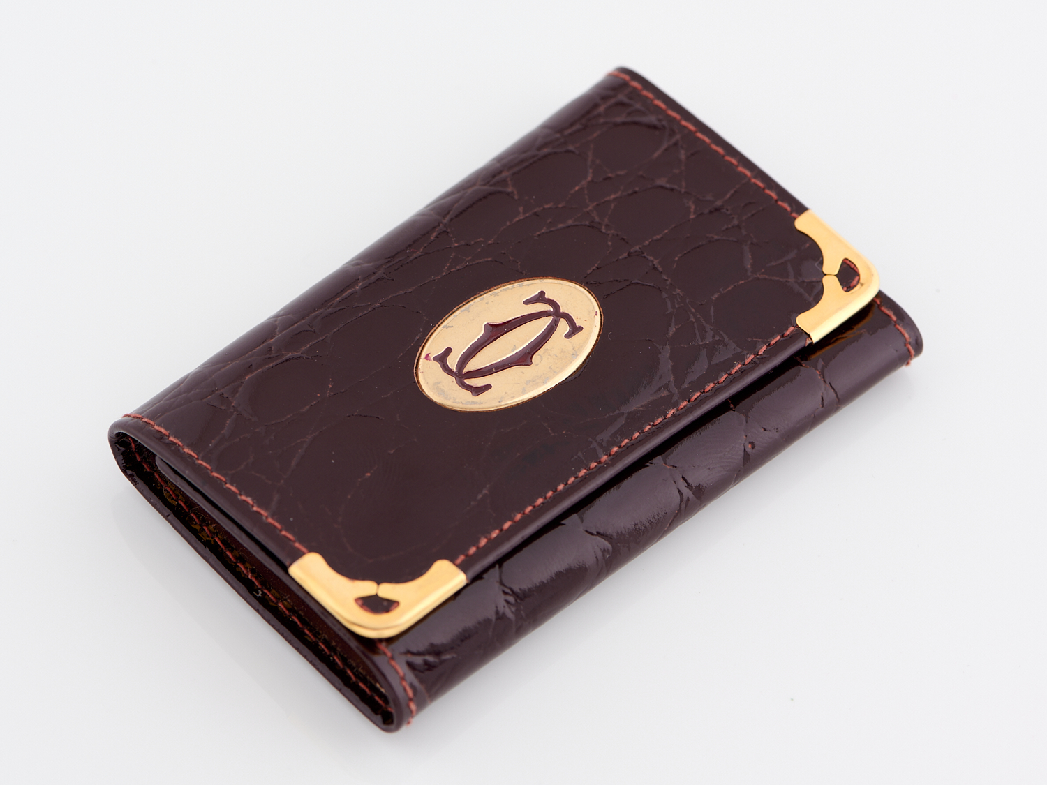 CARTIER, A KEY PURSE IN BURGUNDY LEATHER AND GOLD TONE METAL HARDWARE, 9 X 6 X 1CM