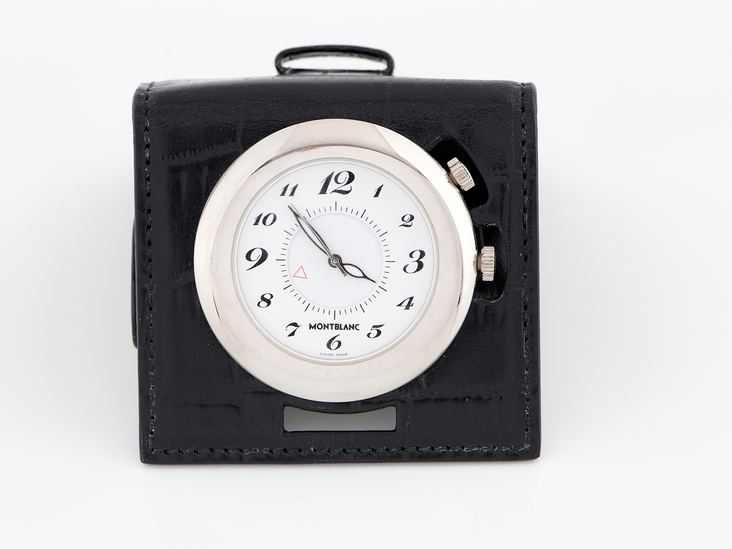 A MONT BLANC, A TRAVEL CLOCK IN STAINLESS STEEL, QUARTZ MOVEMENT, HOUSED IN A LEATHER CASE, LEATHER CASE MEASURING 65MM SQUARE