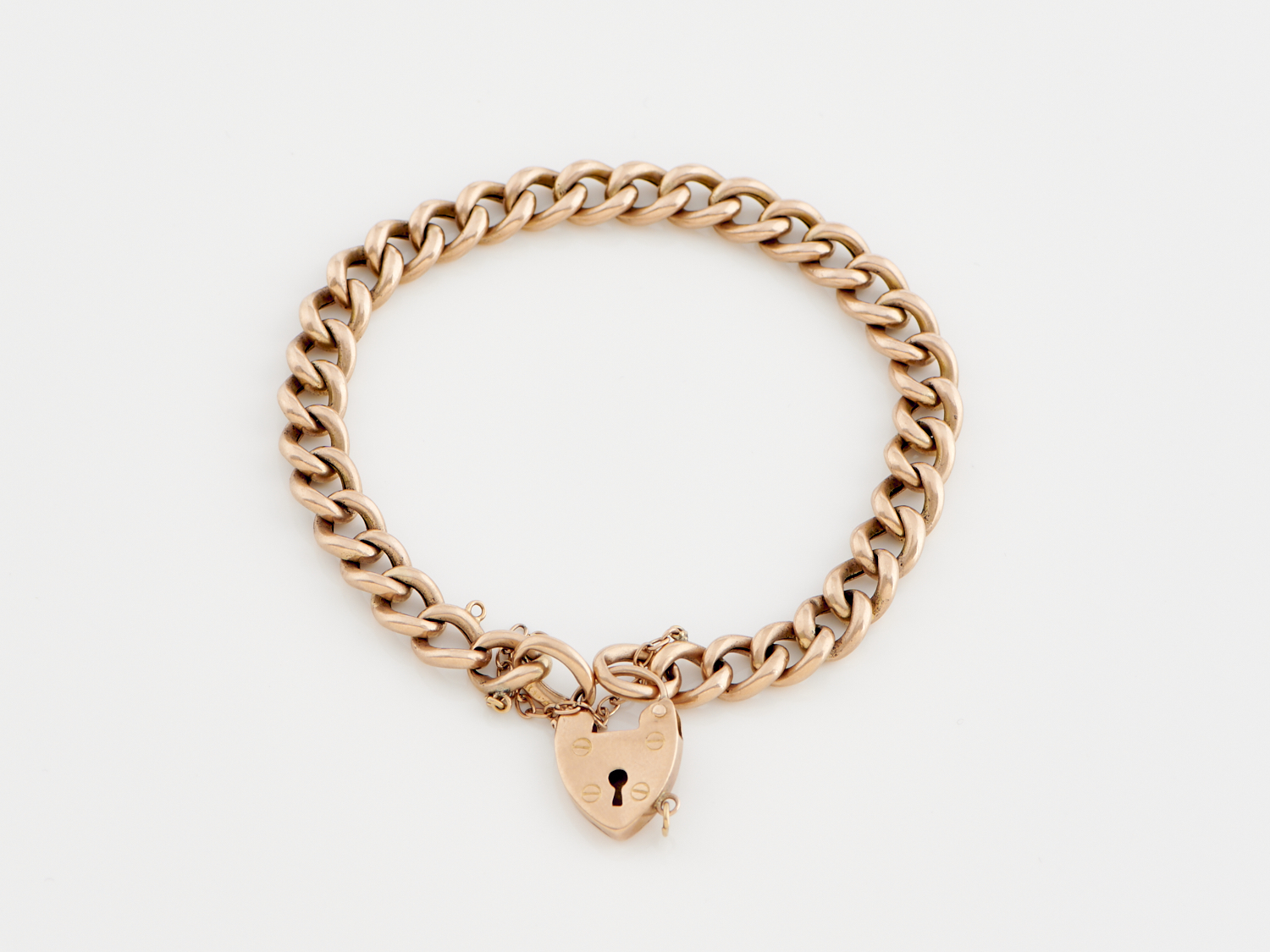 A CURB LINK BRACELET IN 9CT GOLD, WITH HEART PADLOCK, LENGTH 220MM, 15.5GMS