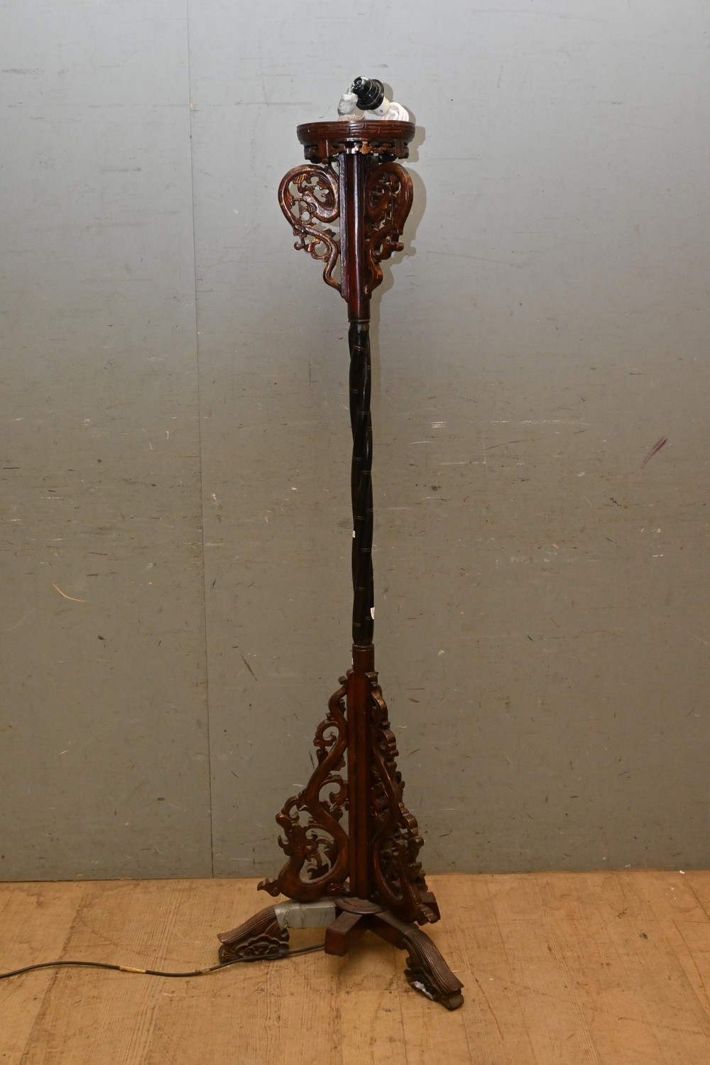 A CHINESE TIMBER CARVED BAMBOO EFFECT STANDARD LAMP (A/F- NOT TESTED) (162H CM) (LEONARD JOEL DELIVERY SIZE: LARGE)