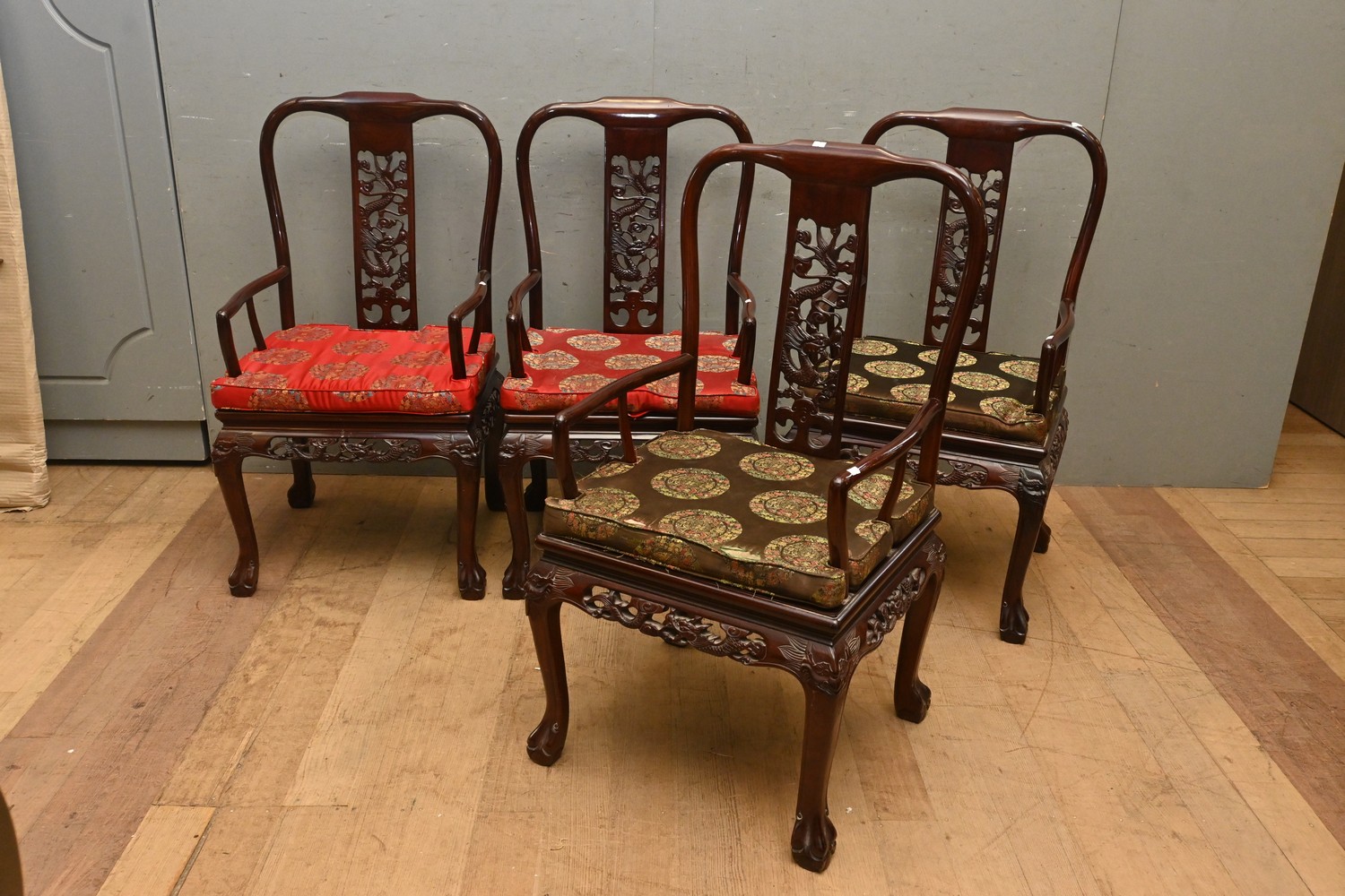 A SET OF FOUR CHINESE CARVED ROSEWOOD DINING CHAIRS (A/F) ( 102H X 55W X 52D CM) (LEONARD JOEL DELIVERY SIZE: X-LARGE)