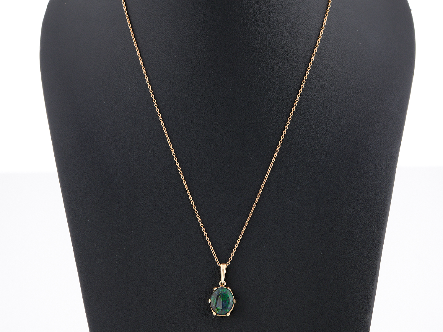 A TREATED OPAL PENDANT NECKLACE IN 9CT GOLD, THE CABOCHON OPAL MEASURING 12 X 10MM, TO A FINE CHAIN IN 9CT GOLD, TOTAL WEIGHT 3.4GMS