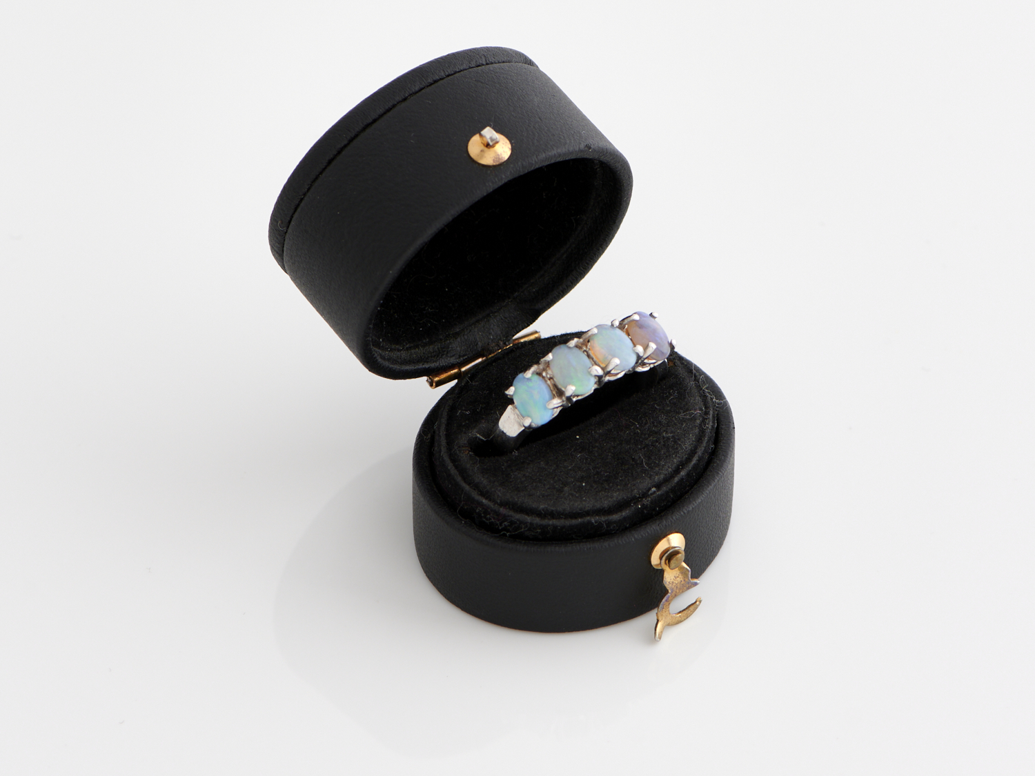 A FOUR STONE OPAL SET RING IN STERLING SILVER, RING SIZE P/Q, BOXED