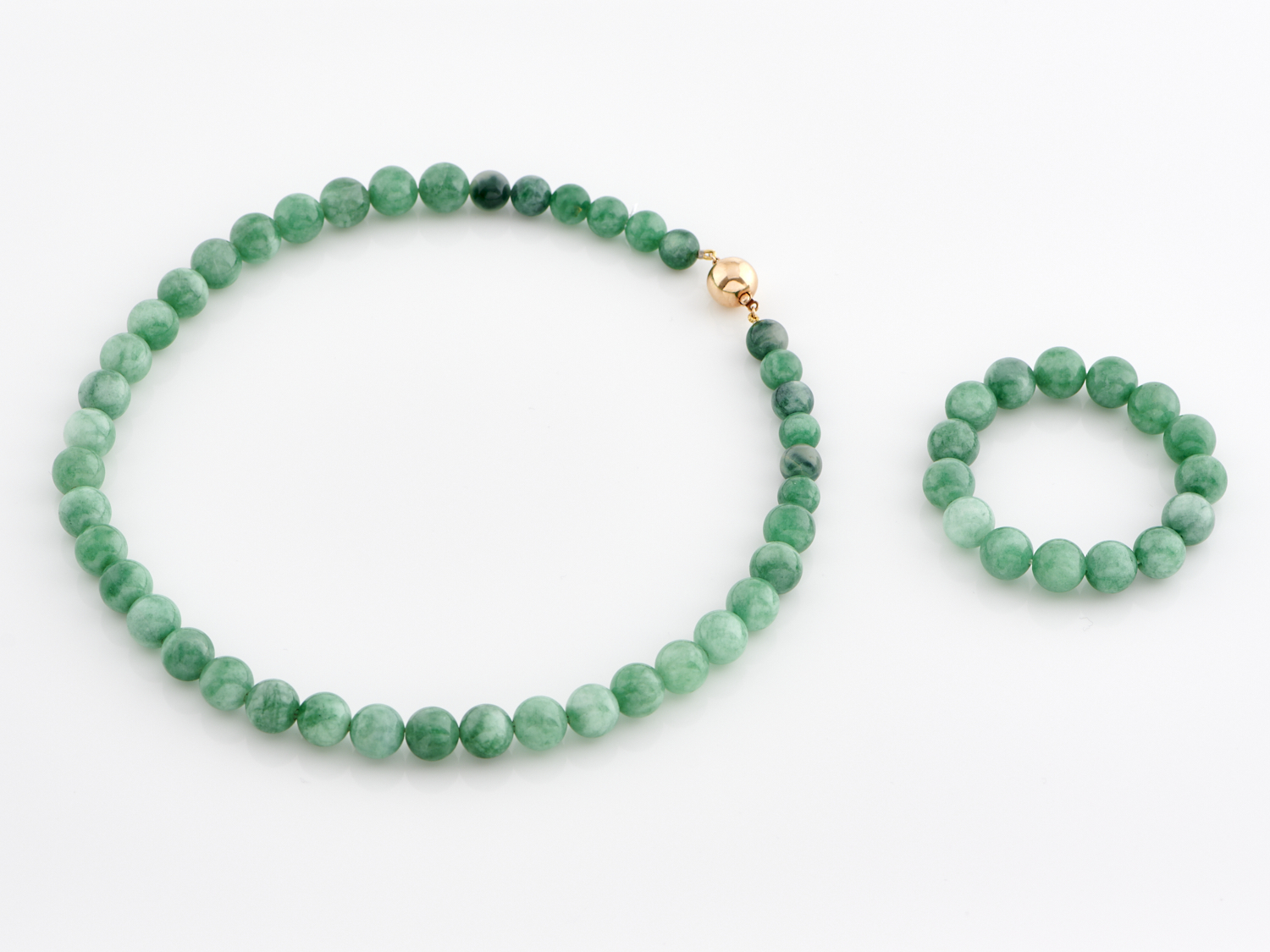 A JADE BEADED NECKLACE TO BALL CLASP IN 14CT GOLD, TOGETHER WITH A BRACELET TO AN ELASTIC BAND
